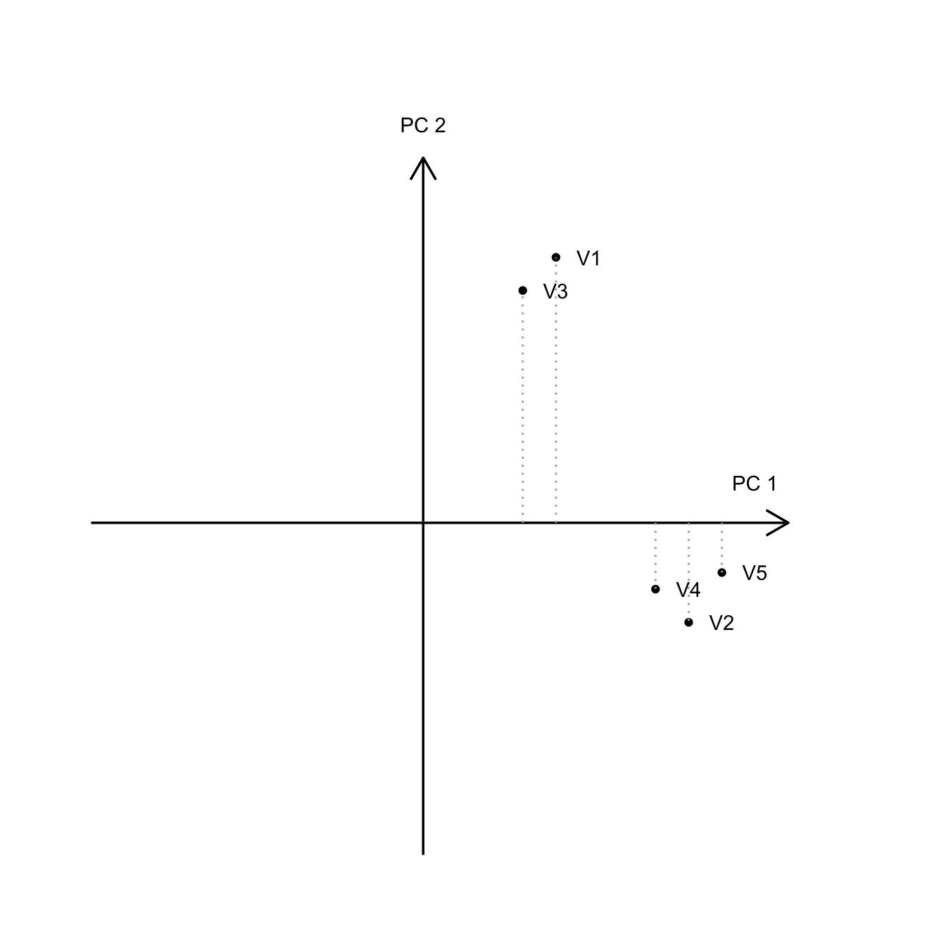 - Hasonlóképpen V1 és V3 tételek töltenek a legerősebben a 2. főkomponensre, míg a V5, V4, V2 a leggyengébben