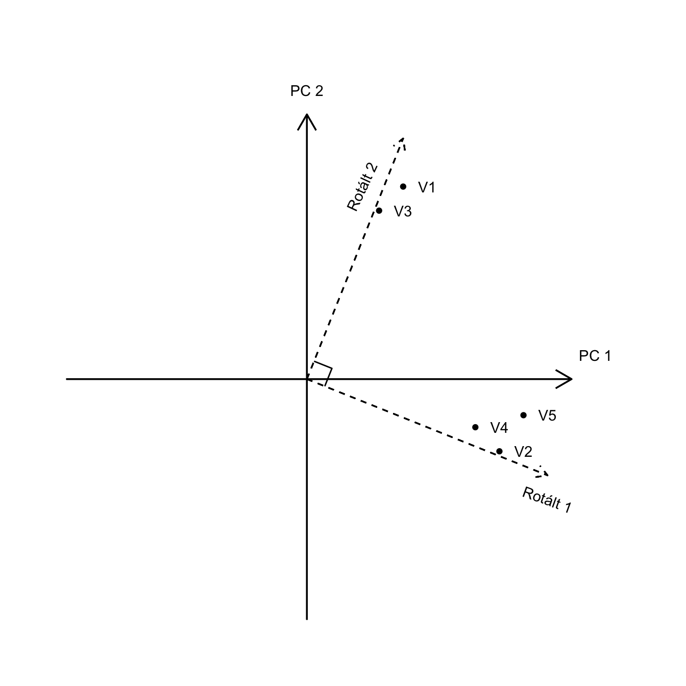 Ortogonális rotáció (orthogonal rotation): derékszöget, függetlenséget megtartó rotáció. Feltételezése, hogy a komponensek/faktorok korrelálatlanok (r = 0). Főbb variánsai: