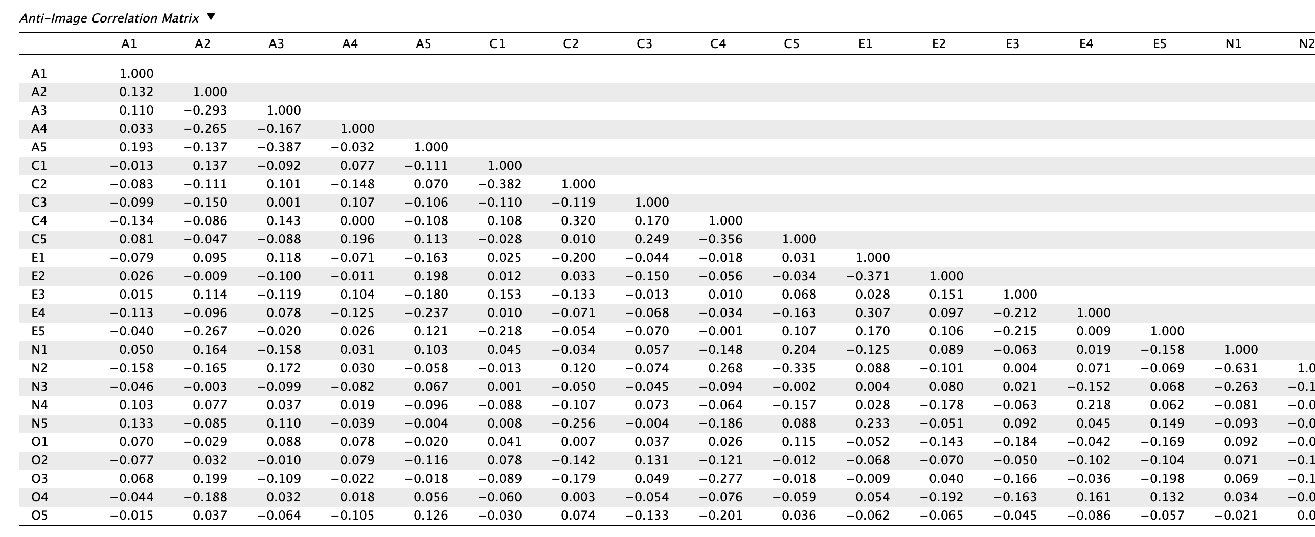 Ez azt jelenti, hogy a mátrix jelenleg nem optimális, mert az itemek között páronként szisztematikus variancia van, amelyeket a főkomponens-elemzésben felállított főkomponensek nem fognak megfelelően lefedni, így például redundáns faktorok/komponensek állhatnak elő. Pszichometriai szempontból érdemes megvizsgálni, hogy például az N1 és N2 tételek nem mérik-e nagyon szűken ugyanazt a jelenséget.