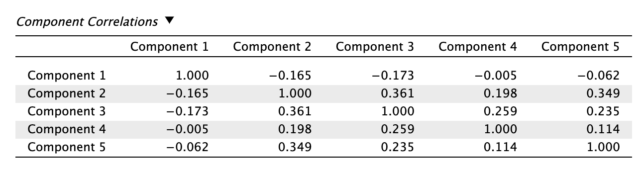 Miután meghatároztuk a főkomponensek számát és elvégeztük a rotációt, a következő lépés a (rotált) komponensmátrix értelmezése. A töltések a mért változó és a főkomponens közötti korrelációt fejezik ki, értékük -1 és +1 között mozog.