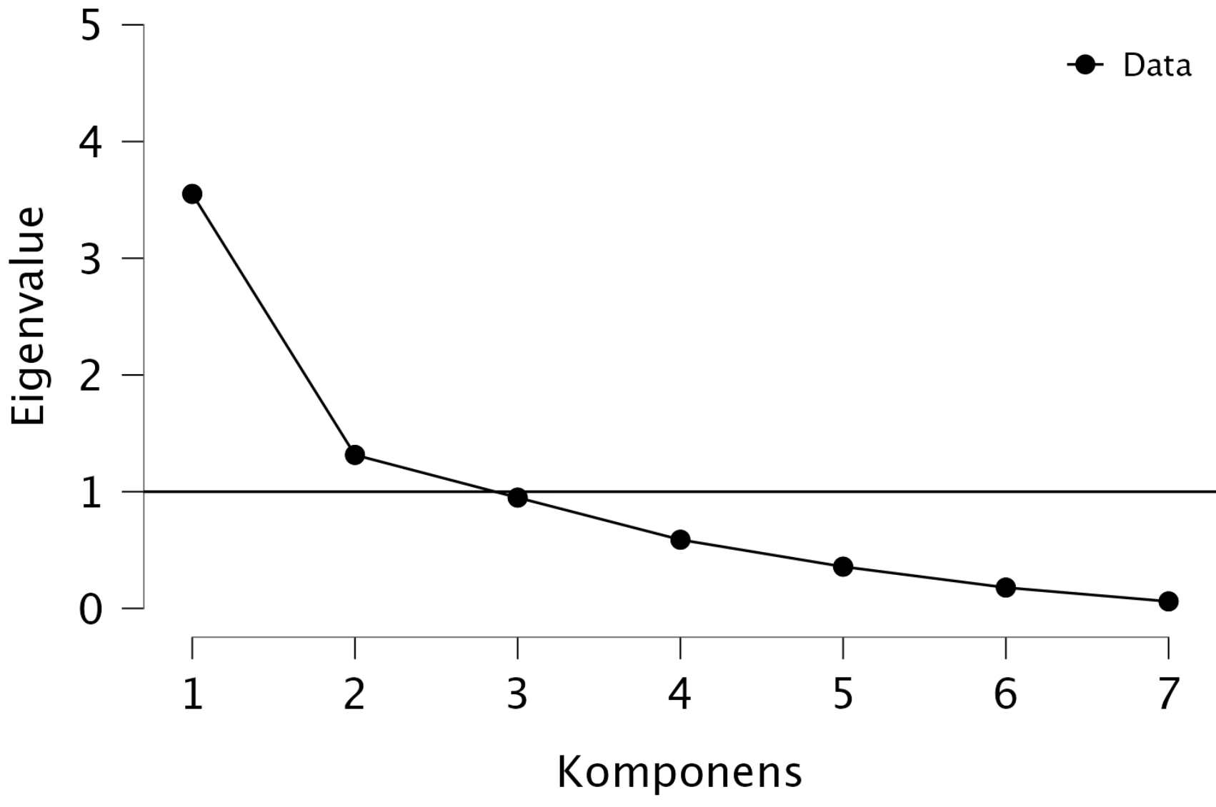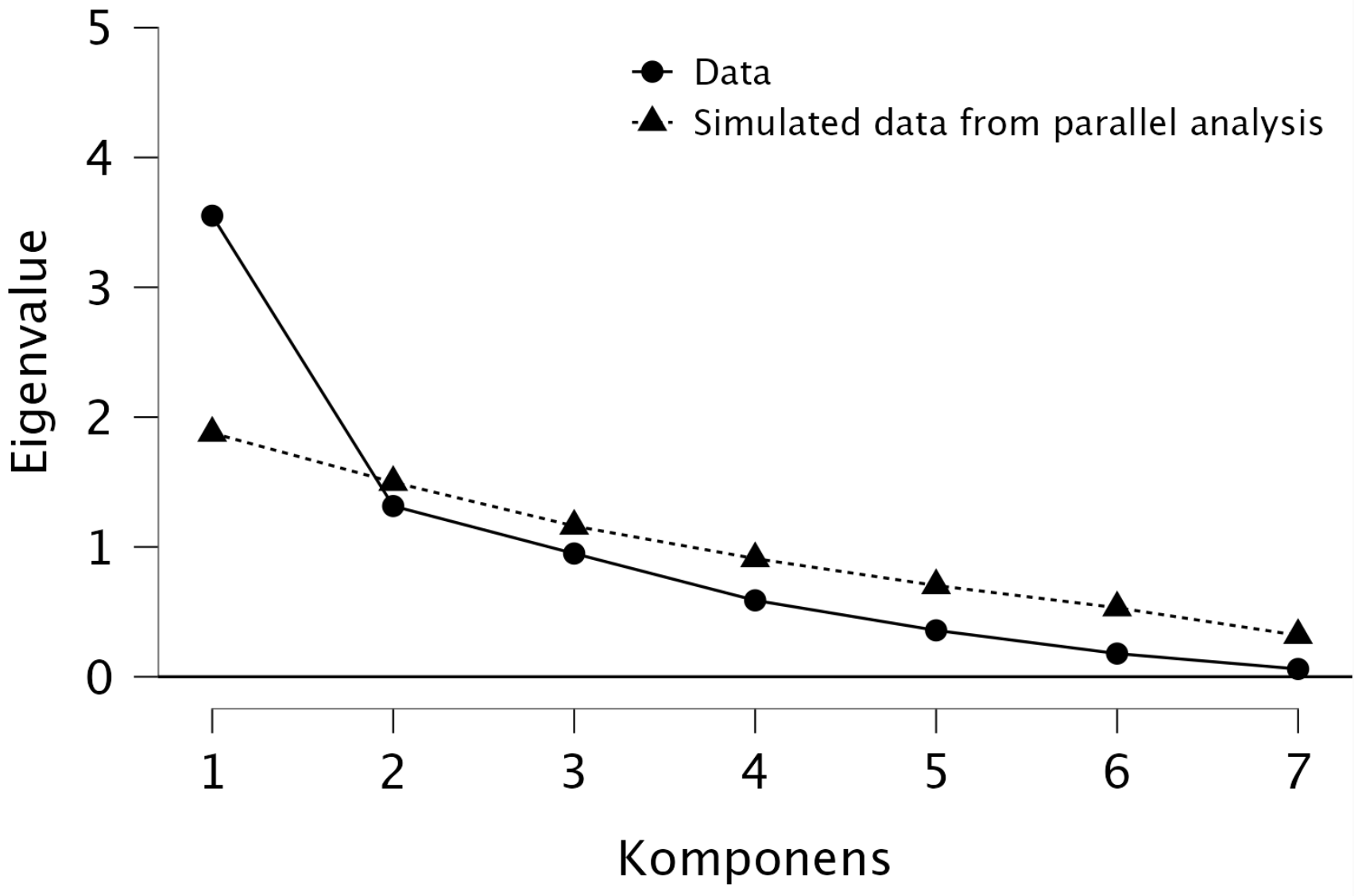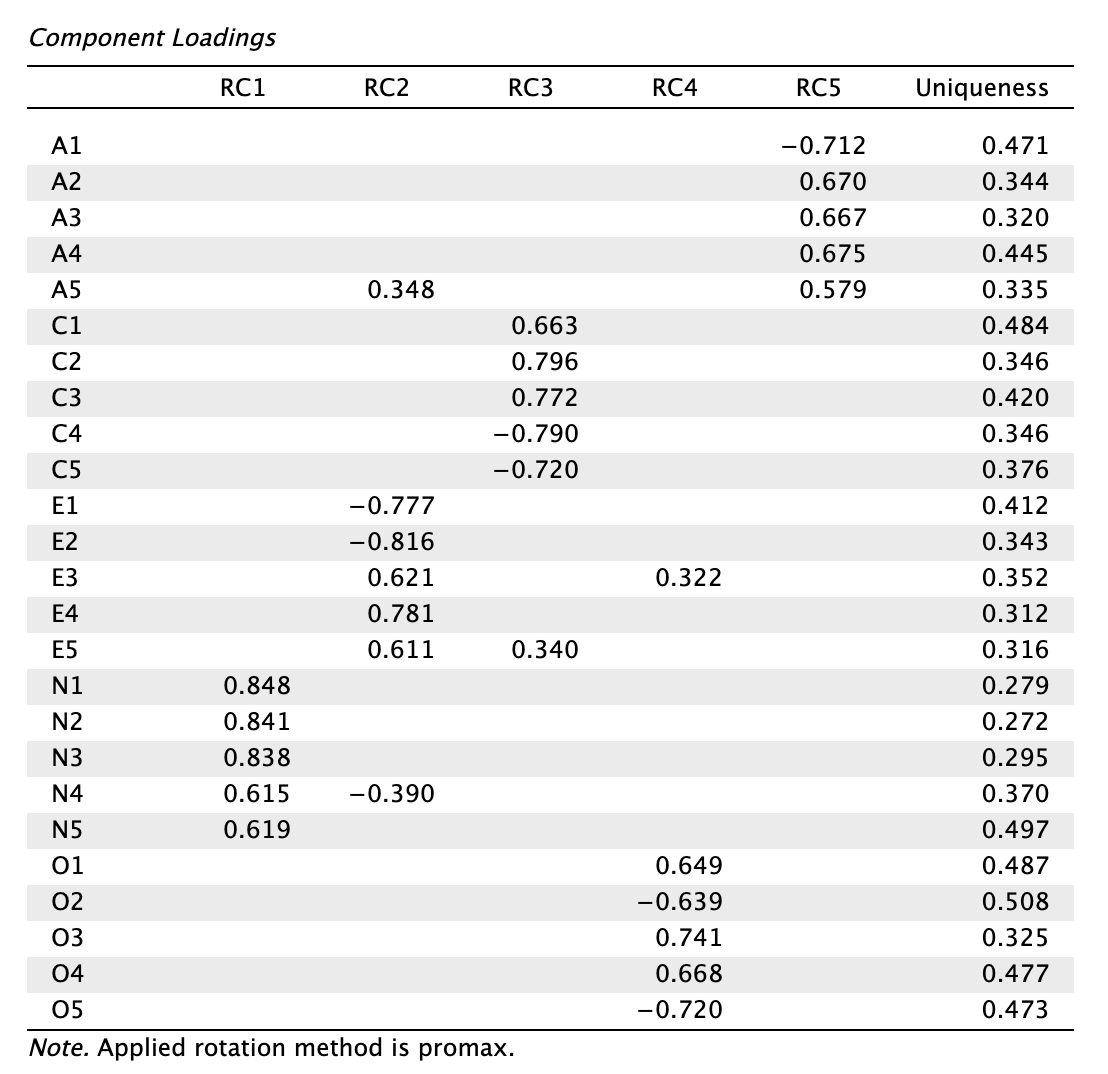 Láthatjuk, hogy ha pusztán a könyökábra meredekség-csökkenése alapján értékelnénk, akkor vagy két komponenst tartnánk meg, vagy hatot. Ha a Kaiser—Guttman-kritérium alapján ítélünk (eigenvalue > 1), akkor éppenhogy 5-t. A Horn-féle parallelanalízis — ami a modernebb kritérium — eredménye 5 főkomponens. (Mellékesen tudjuk, hogy a Big Five itemek 5 komponenst kellene eredményezzenek.)