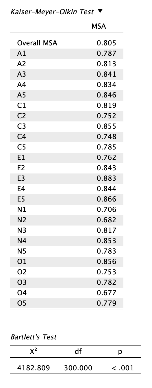 A Kaiser-Meyer-Olkin-féle megfelelőségi mutató (KMO) és a Measures of Sampling Adequacy mutatók (MSA) segítségével azt értékeljük, hogy az adatok megfelelőek-e faktoranalízishez/főkomponens-elemzéshez. Gyakorlatilag a két mutató ugyanaz, csak míg a KMO az összes itemre (a teljes redukálandó adathalmazra) vonatkozik, addig az MSA csupán egyes itemekre. Értékük 0 és 1 közötti értéket vehetnek fel.