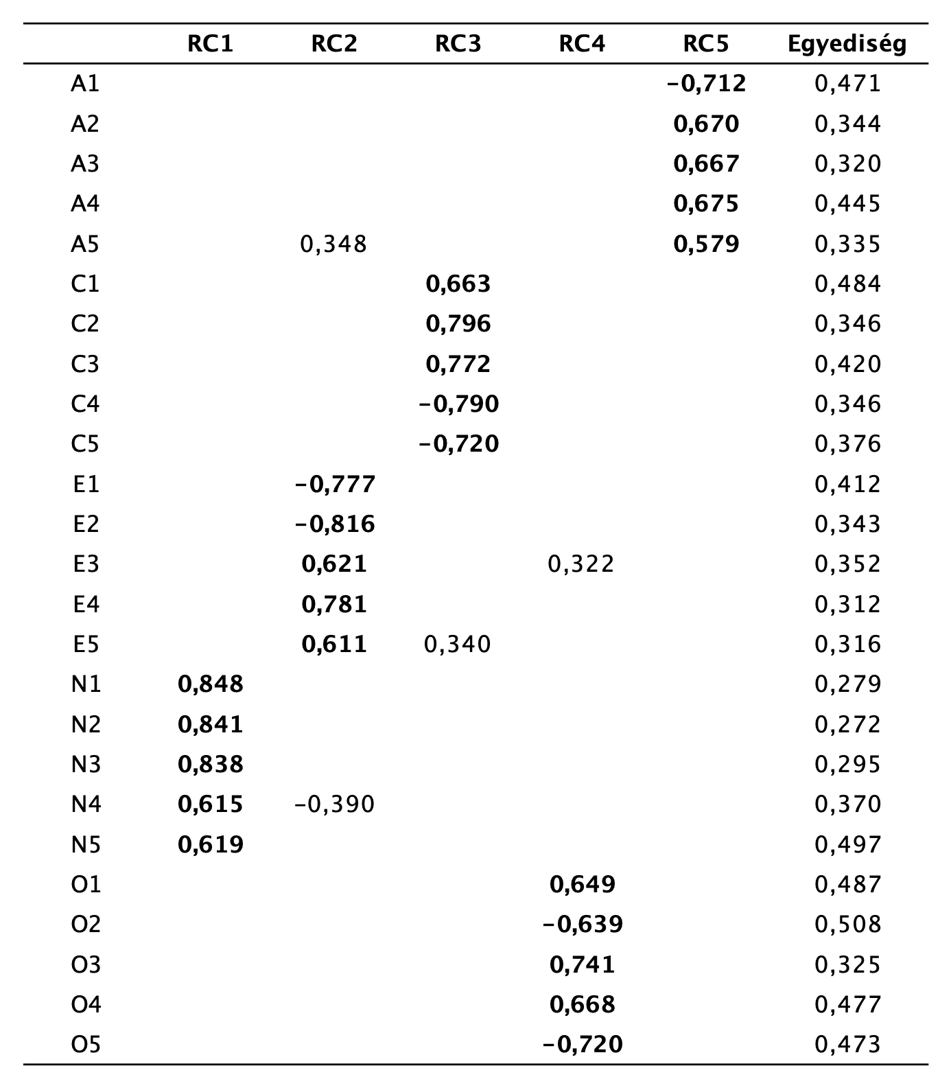 Megjegyzés. RC1 = Neuroticizmus; RC2 = Extraverzió; RC3 = Lelkiismeretesség; RC4 = Nyitottság; RC5 = Barátságosság. A ∣0,32∣ alatti töltéseket mellőztük.