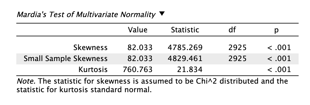 A Mardia-féle többváltozós ferdeségi és csúcsossági mutatót a többváltozós normalitás tesztelésére alkalmazzuk. Ha szignifikáns, akkor a Pearson-féle korrelációs mátrix helyett polikorikus korrelációs mátrixot kell használnunk az adatredukcióhoz.