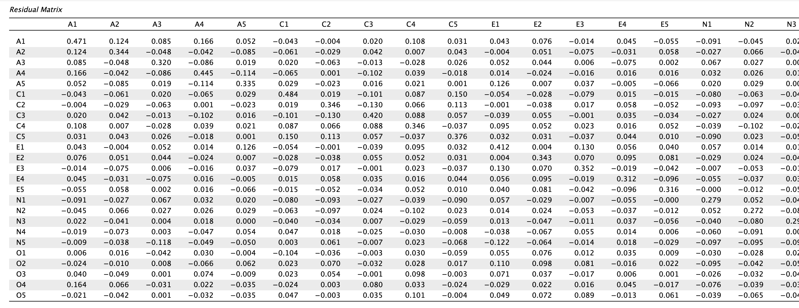 Láthatjuk, hogy a mátrix nagy részében az értékek (abszolút értékben) alacsonyak, tehát az 5 komponens megfelelően és takarékosan (parsimoniously) nyerte ki a közös varianciát. Maradtak azonban jelentős varianciák egyes változópároknál (pl. A1-A4, A1-O4, C1-C5, O2-O4, O3-O5). Extrém magas (> |0,30|) maradványértékek nincsenek. Összesen 109 változópár maradványértéke magasabb, mint |0,05|, de ez csupán a párok 36%-át teszi ki.