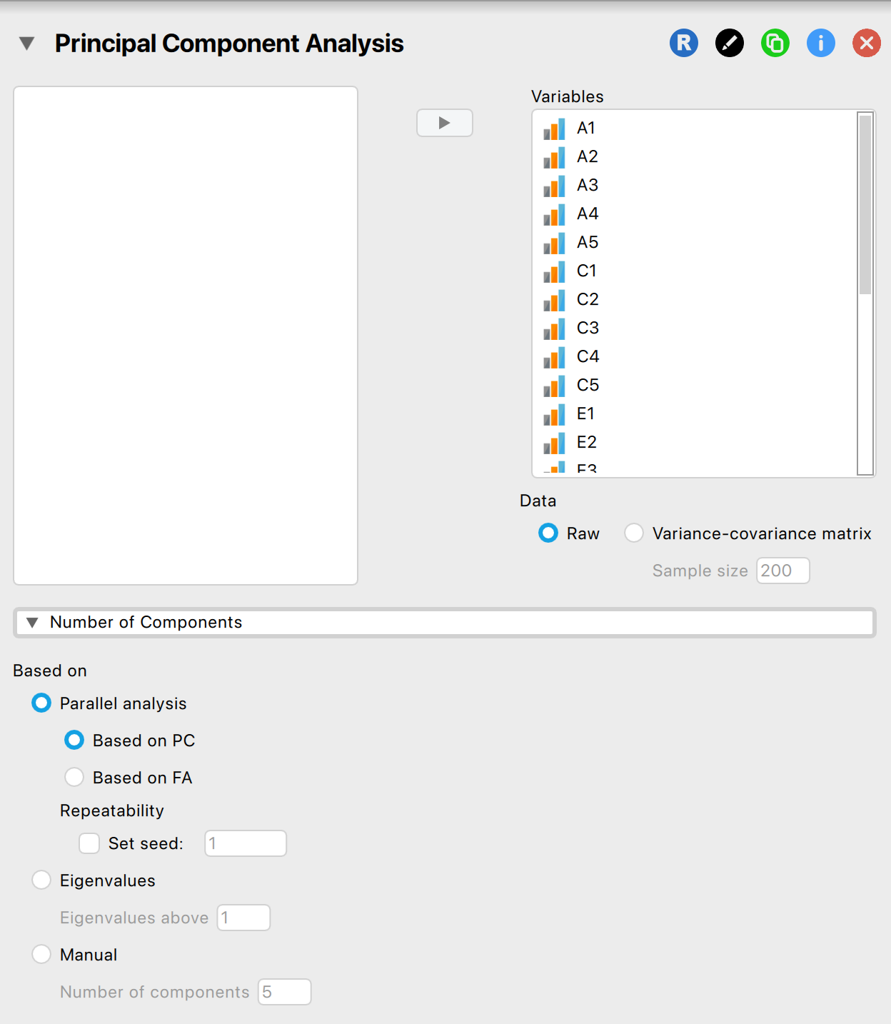 - Number of components szekcióban a Based on rovaton belül a Horn-féle parallelanalízist választjuk (Parallel analysis), azon belül pedig - mivel főkomponenselemzést végzünk (PC) és nem faktoranalízist (FA) - a PC opciót választjuk.