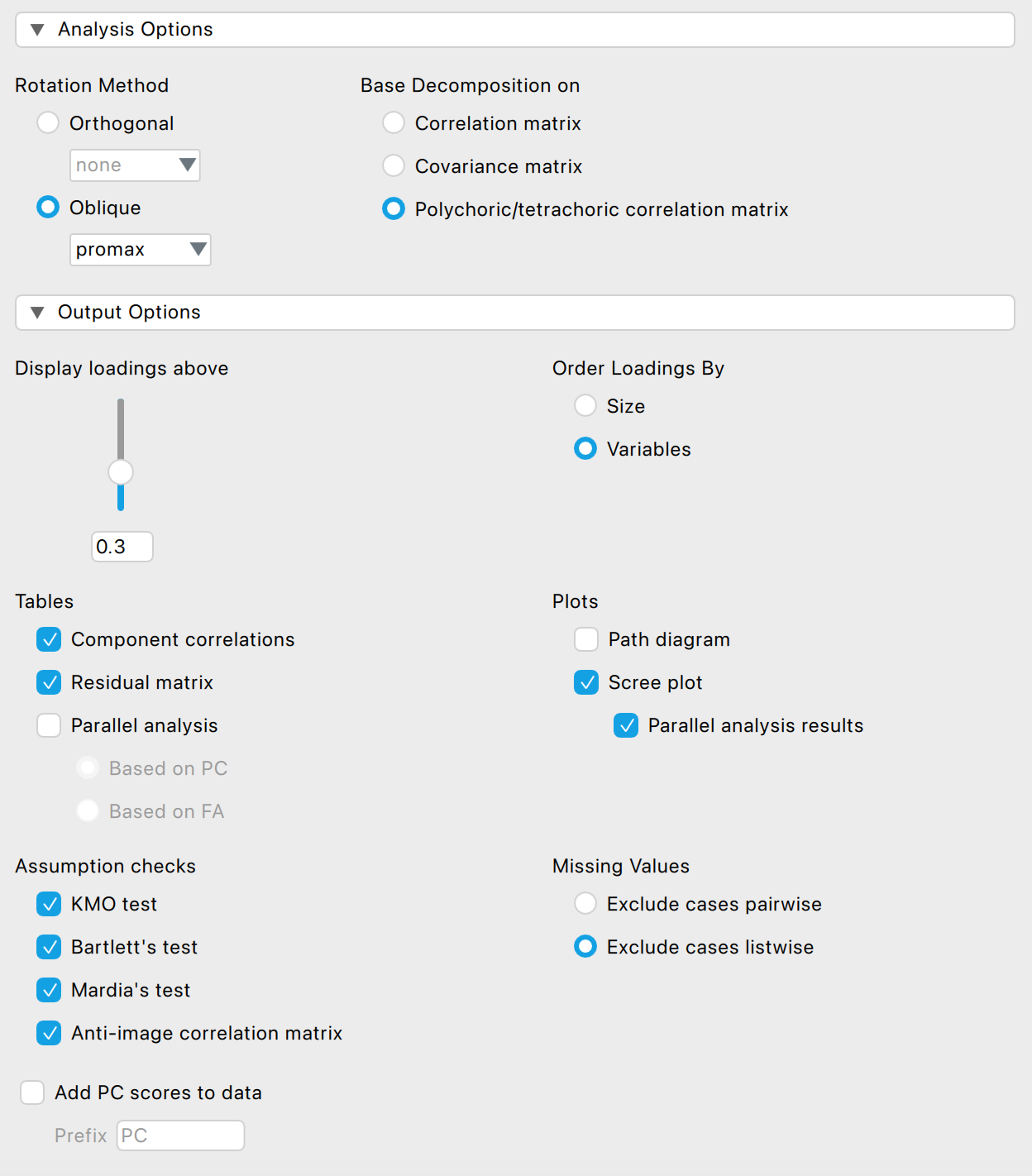 - pipáljuk ki az Assumption cheks szekció összes mezőjét, de minimum a KMO test, Bartlett’s test opciókat!