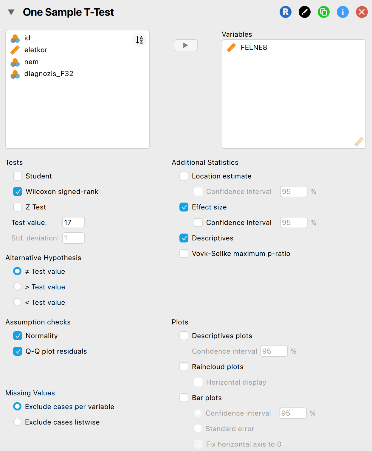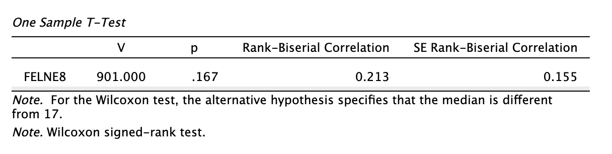 Az alternatív hipotézisünk a 17,00 átlagértékhez viszonyít kétoldalasan. (“For the Wilcoxon test, the alternative hypothesis specifies that the mean is different from 17.”)