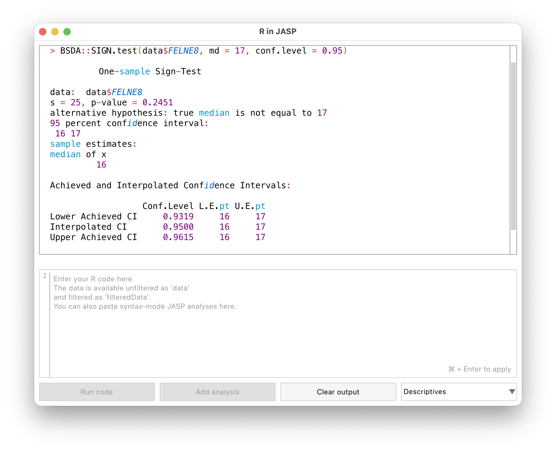 Mivel ez a próba nem része a JASP-nak a fejezet írásakor, az R konzolhoz kell fordulnunk.