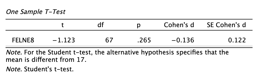 Megoldás 9.2. A mintánk átlaga (M = 16,09, SD = 6,69) nem tér el szignifikánsan a norma szerinti 17,00-s értéktől (t(67) = -1,123, p = 0,265, d = -0,136).