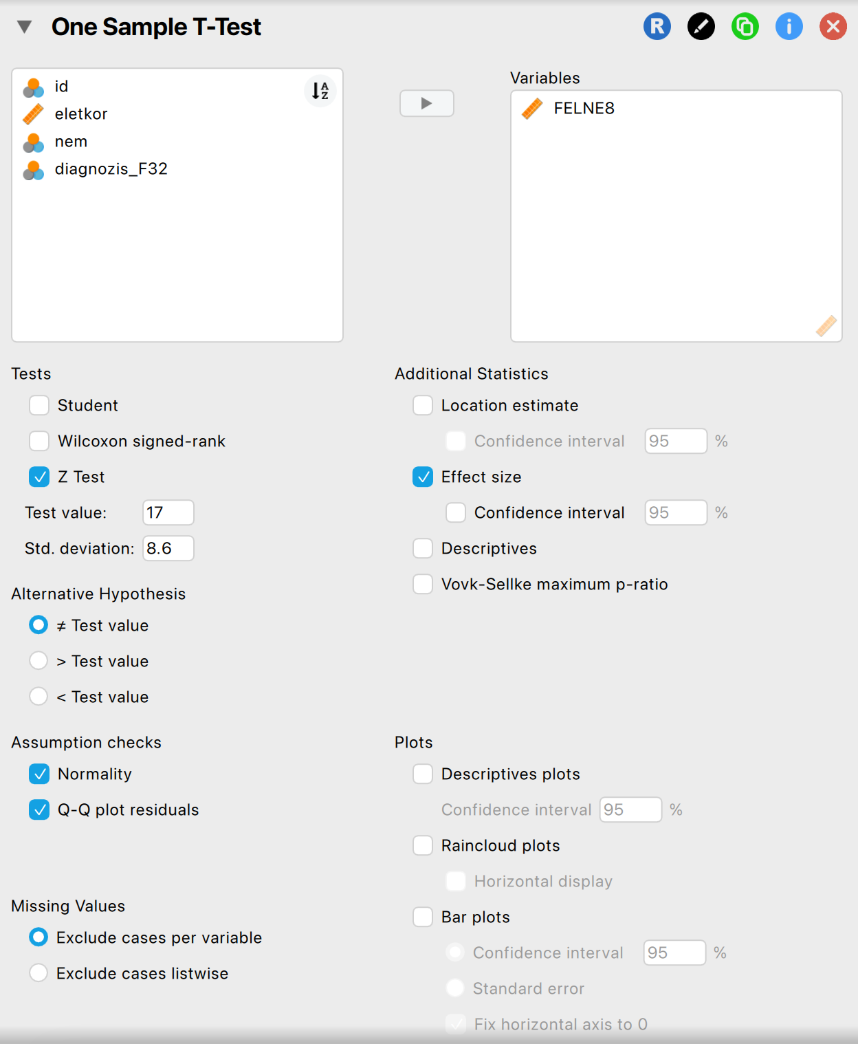 A populáció ismert változóját (ti. átlag) beállítjuk a „Test value” mezőben.