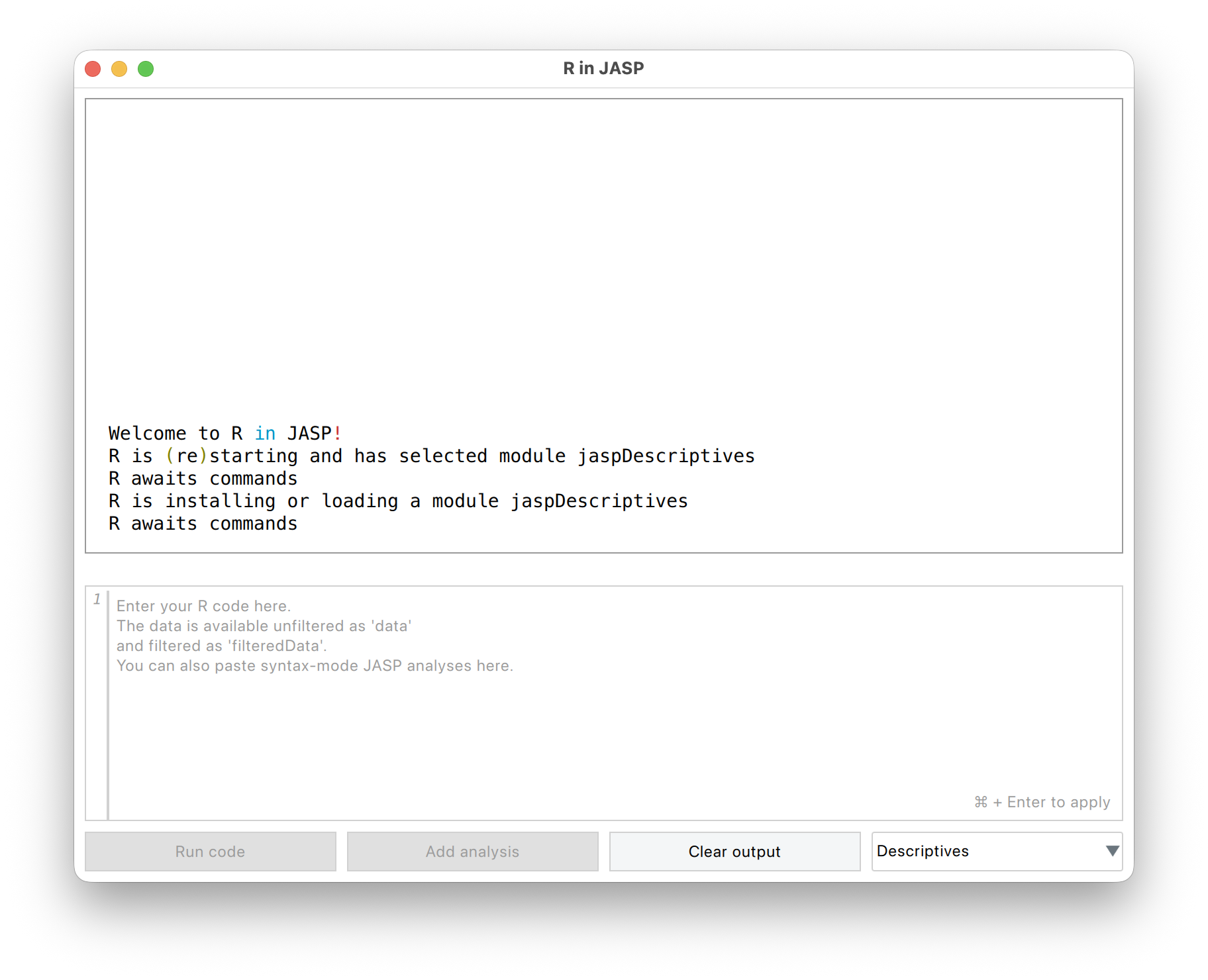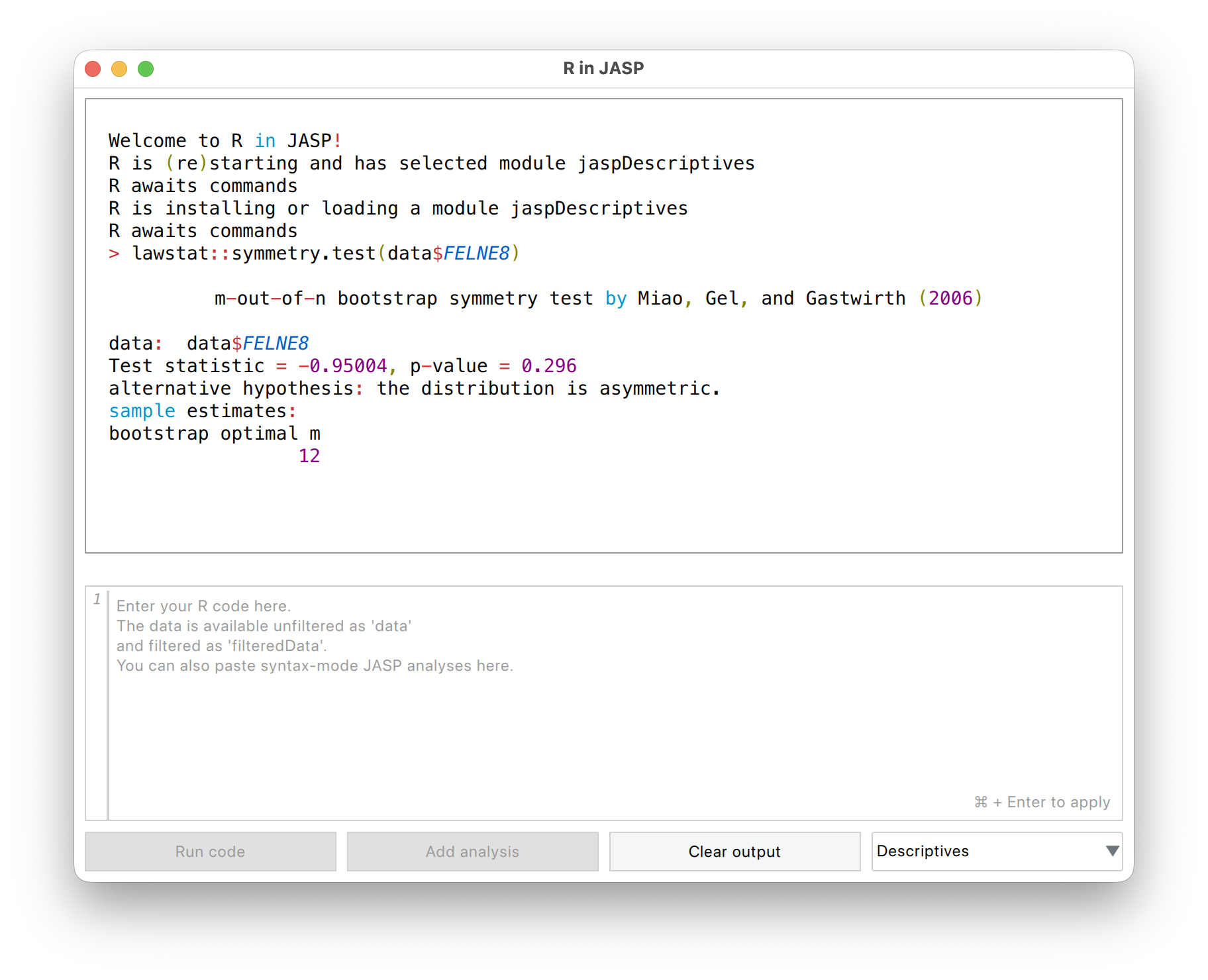 Kiegészítés 9.5 (Szimmetriapróbák futtatása JASP-ban). A szimmetriapróbák nem részei a normál JASP moduloknak (a fejezet írásakor 0.95.4). Azonban a JASP a háttérben R-ben végez számításokat, és hozzáférést ad egy R konzolhoz is. Ez korlátozott funkcionalitású, de ezen belül elvégezhetőek a próbáink.