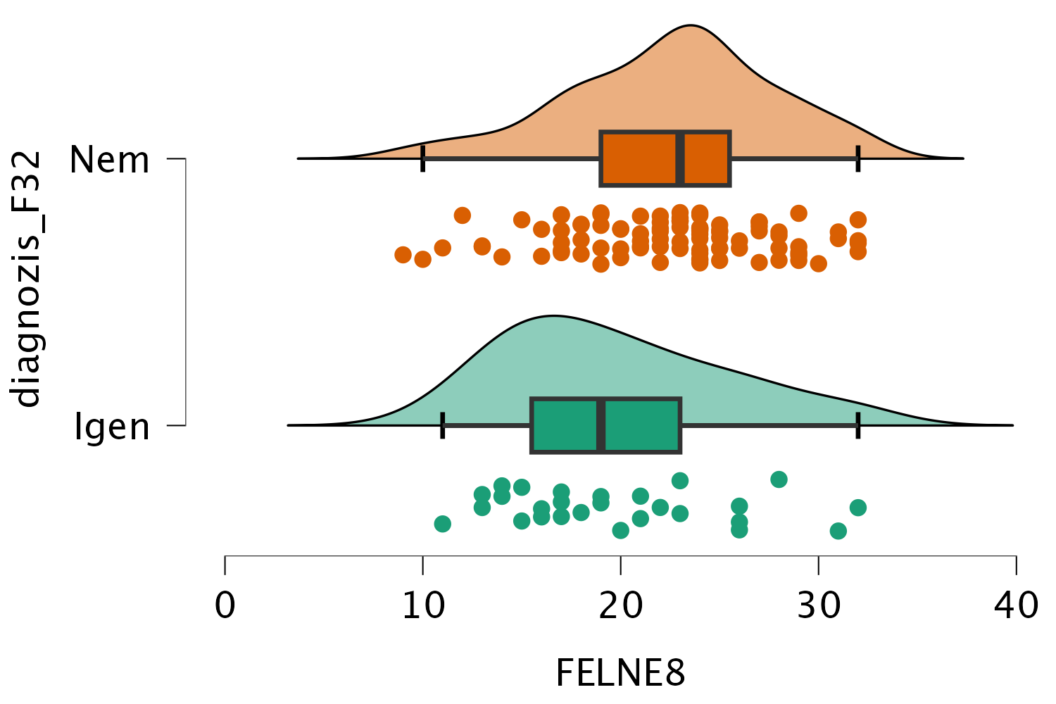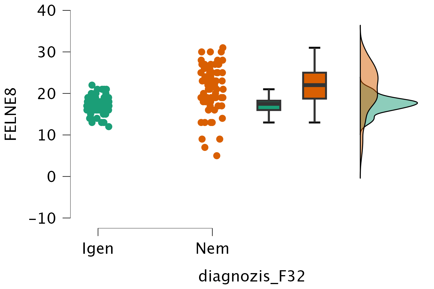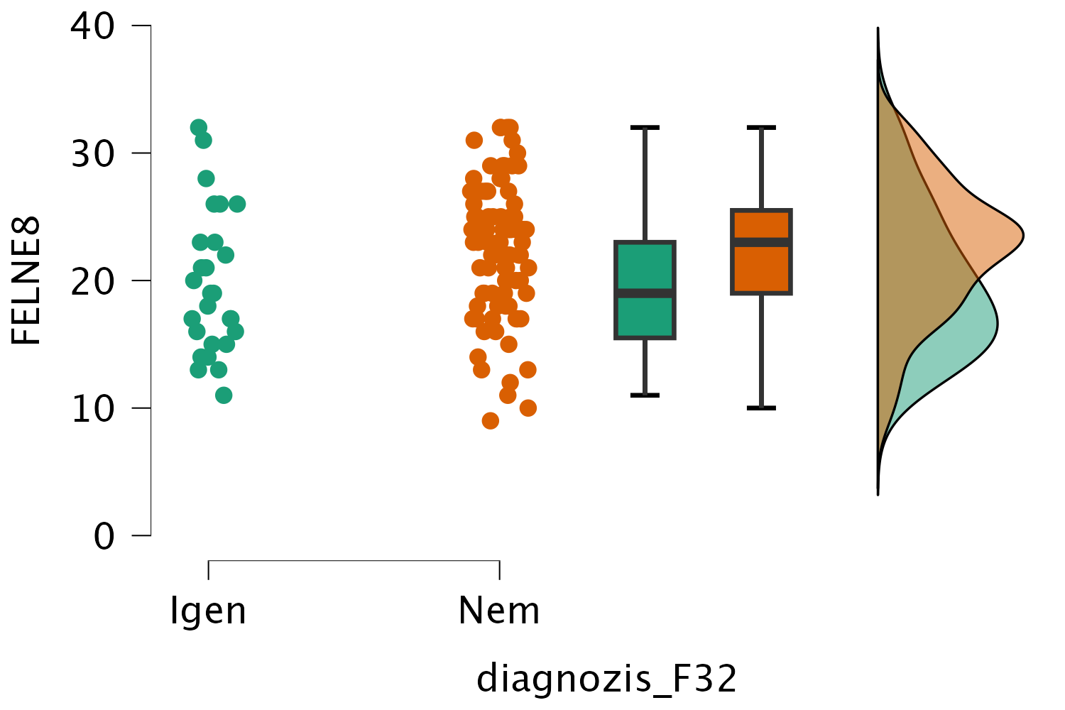 Példa 10.3 (Példa nem normál eloszlású adatok függetlenmintás próbájára) Szeretnénk megtudni, hogy az általunk mért félelem a negatív megítéléstől átlagpontszám (FÉLNE-8) különbözik-e a major depresszióval (F32.XX) diagnosztizáltak és nem diagnosztizáltak között.