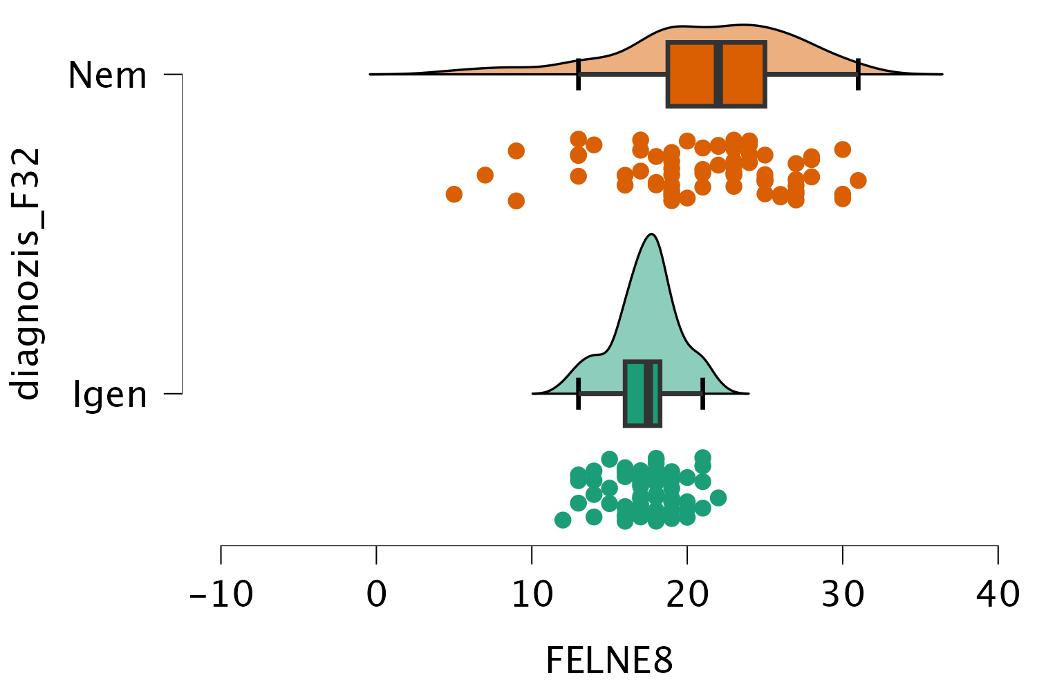 Példa 10.2 (Példa Student-féle t-próbára nem illesztett minta esetén) Szeretnénk megtudni, hogy az általunk mért félelem a negatív megítéléstől átlagpontszám (FÉLNE-8) különbözik-e a major depresszióval (F32.XX) diagnosztizáltak és nem diagnosztizáltak között.