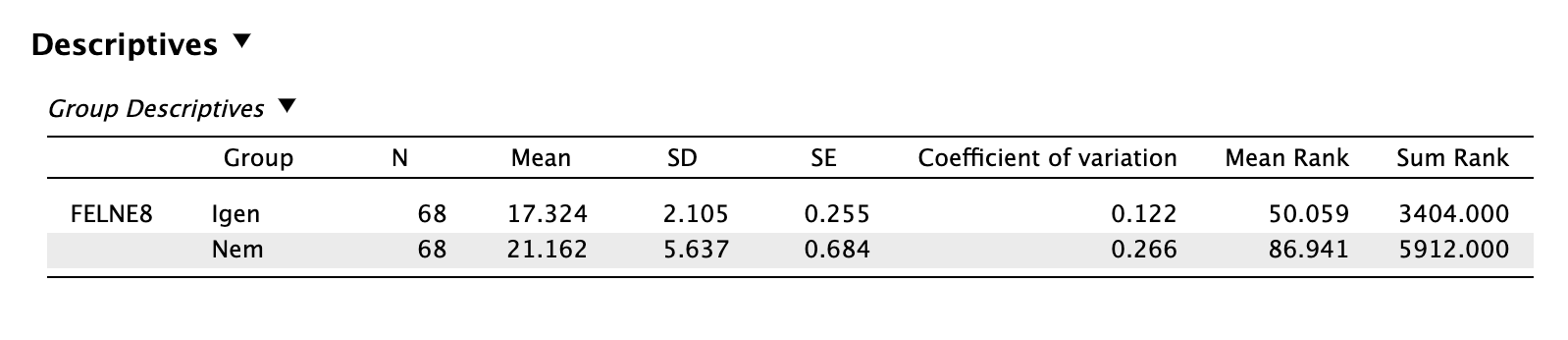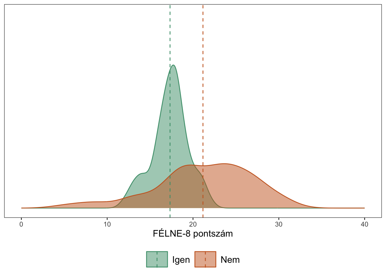 A depresszióval diagnosztizáltak FÉLNE-8 pontszáma (M = 17,32, SD = 2,11) statisztikailag szignifikánsan különbözik a depresszióval nem diagnosztizáltak pontszámától (M = 21,16, SD = 5,64), a különbség nagy hatásnagyságú: W = 1058, p < 0,001, rrb = -0,542.