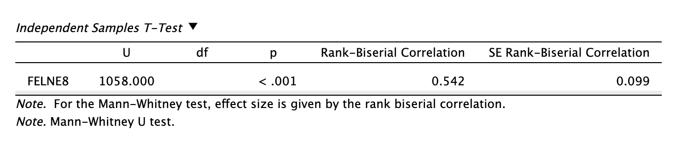 A JASP a megjegyzések között jelzi nekünk, hogy a lehetséges t-próbák közül a Mann-Whitney-féle rangpróbát végezzük („Mann-Whitney U test”).
