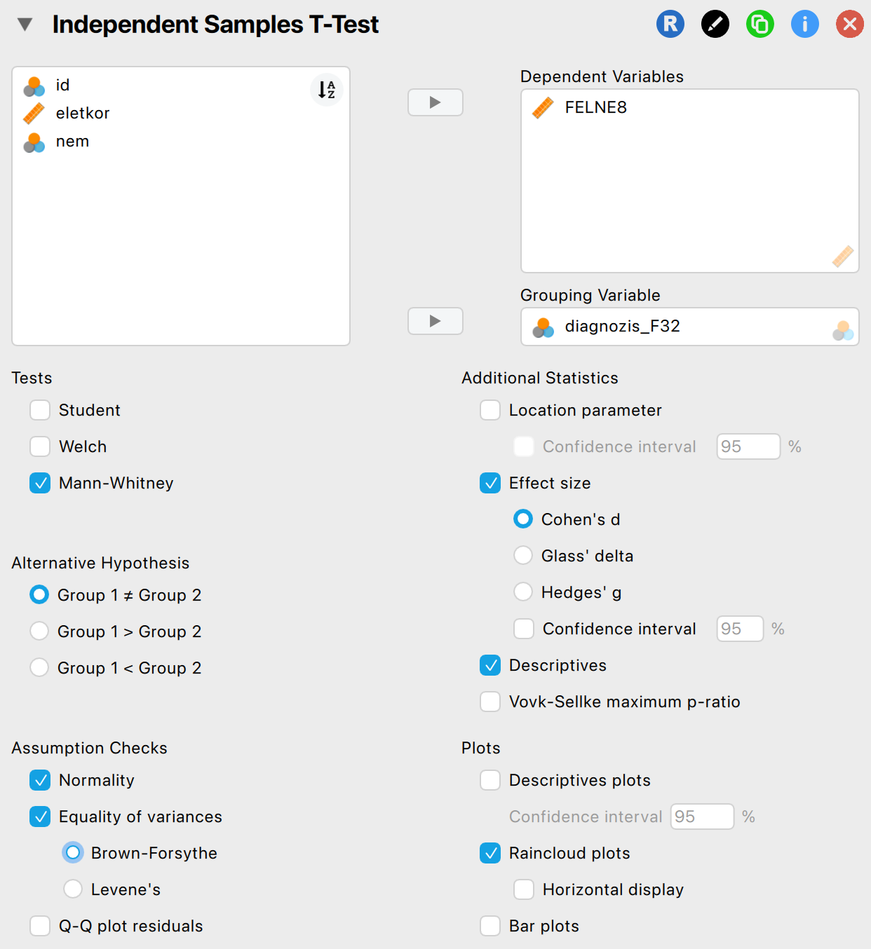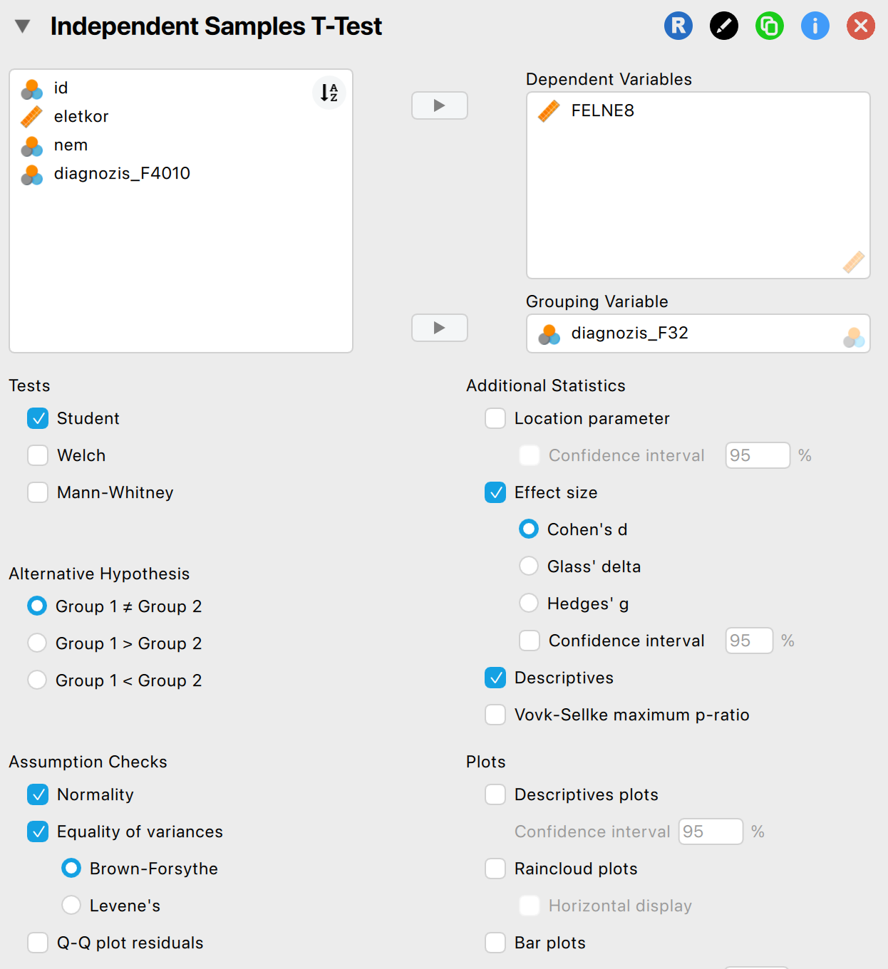 Nullhipotézis (H0): A depresszióval diagnosztizáltak és depresszióval nem diagnosztizáltak FÉLNE-8 pontszámon mért csoportátlaga megegyezik. Alternatív hipotézis (H1): A depresszióval diagnosztizáltak és depresszióval nem diagnosztizáltak FÉLNE-8 pontszámon mért csoportátlaga eltér.