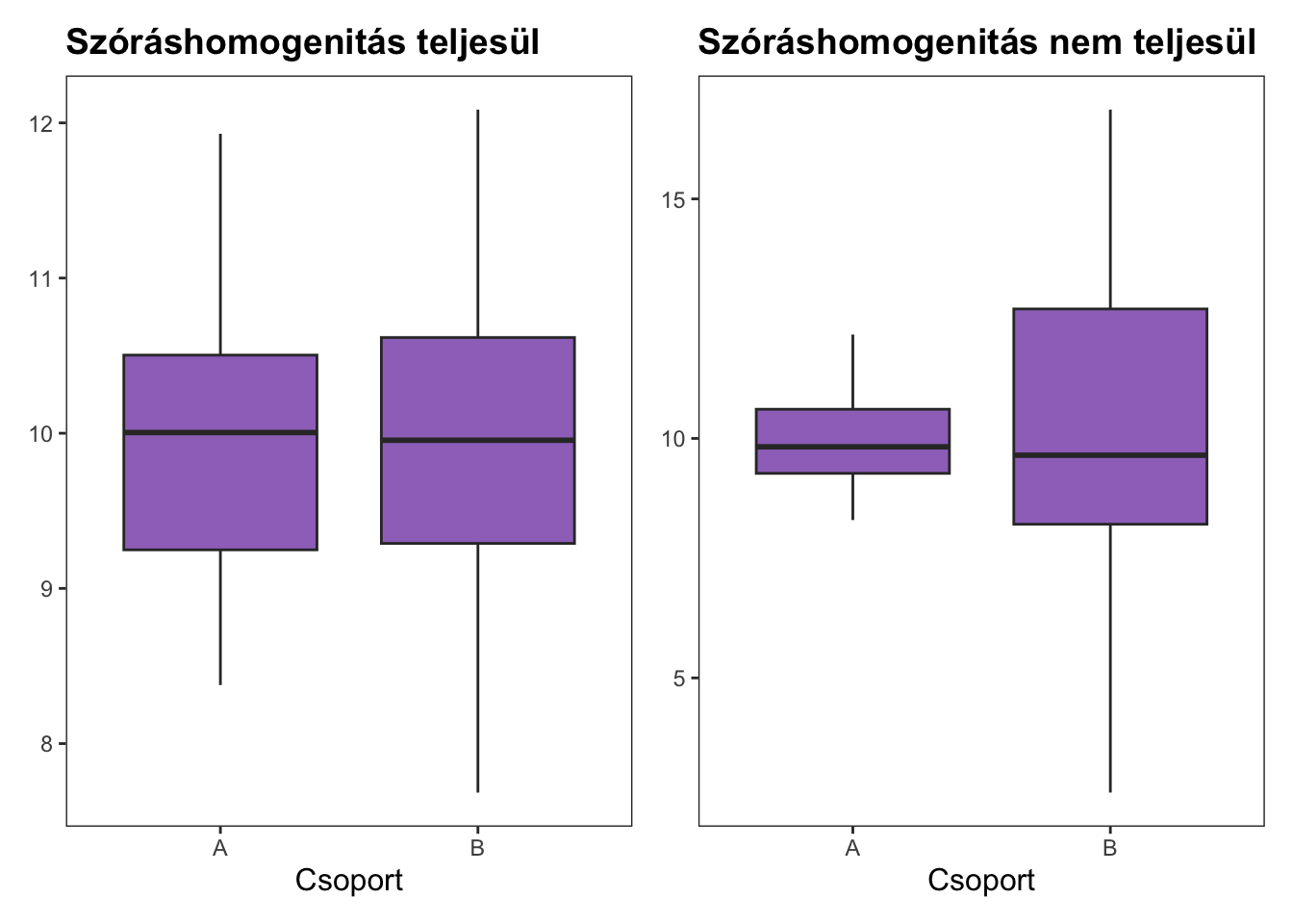 Definíció 10.1 (szóráshomogenitás) (equality of variances, homogeneity of variance)
