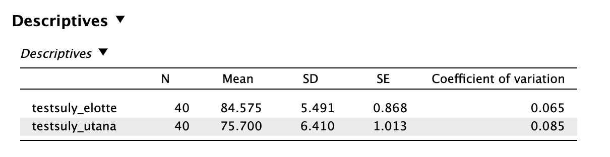 A csoportok átlagát és szórását az eredmények közlésekor le kell írni. Ehhez nem szükséges elnavigálni, a t-próbáknál a Descriptives kipipálásával a szükséges leíró statisztikák előállnak: