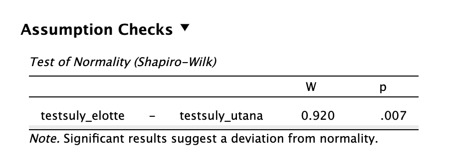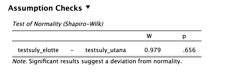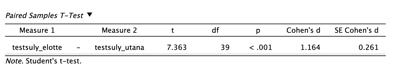 A JASP a megjegyzések között jelzi nekünk, hogy Student-féle t-próbát végzünk (a páros formát).