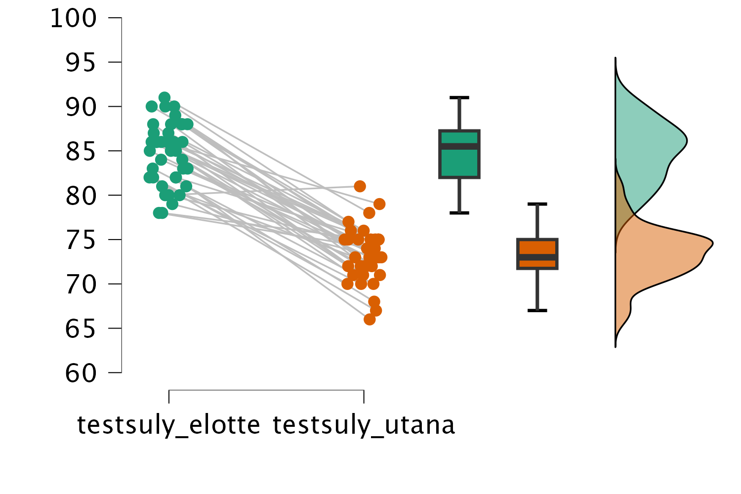 Egy boxplotpár és sűrűségfüggvény-pár kombinációját tartalmazó ábrát készíthetünk a JASP segítségével a modulon belül a Raincloud plots funkció kipipálásával: