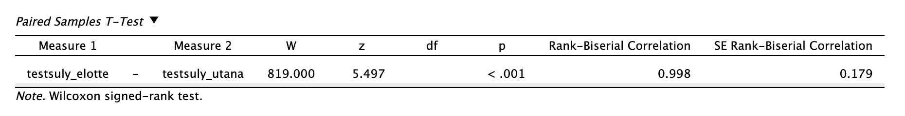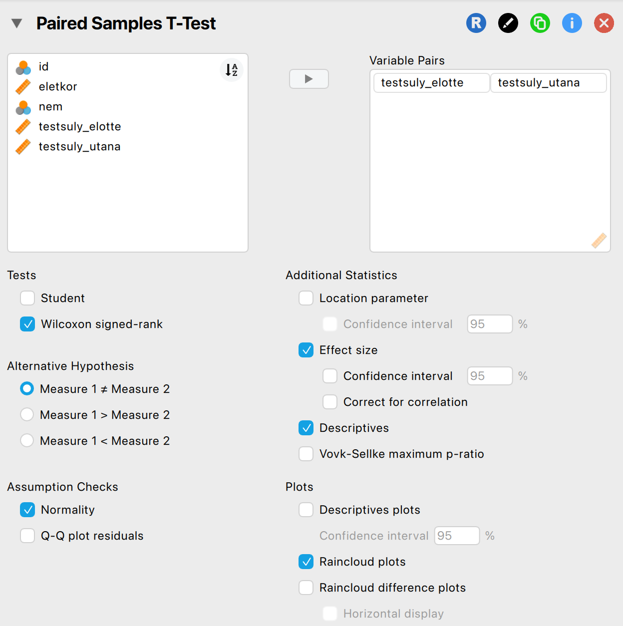Amennyiben a változónk nem követik a normál eloszlást, úgy Wilcoxon előjeles rangpróbát1 futtatunk.