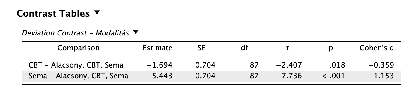 simple contrast Az eredmények alapján mind a CBT, mind a sématerápia esetén alacsonyabb lesz a depresszió pontszám statisztikailag szignifikáns t-próba eredményekkel. Vagyis mindkét modalitás hatékonyabb az alacsony intenzitású terápiánál, de a kettő közül a sématerápia t-próba statisztikája és hatásnagysága alapján az ő „fölénye” markánsabb. (Ne feledjük, az előjel a különbség irányát jelöli!)