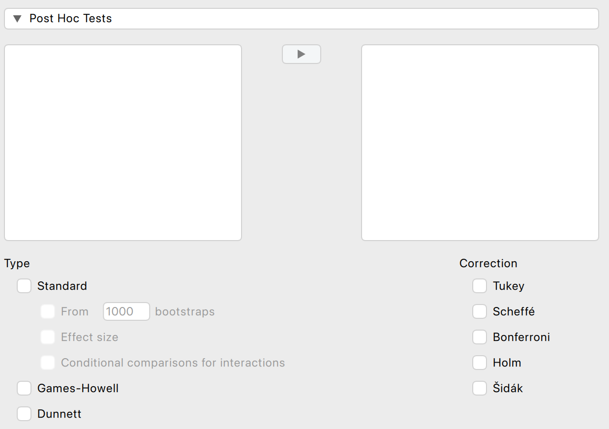 Aszerint kell választanunk post-hoc tesztet, hogy fennáll-e a szóráshomogenitás. A JASP felületén található post-hoc korrekciók: