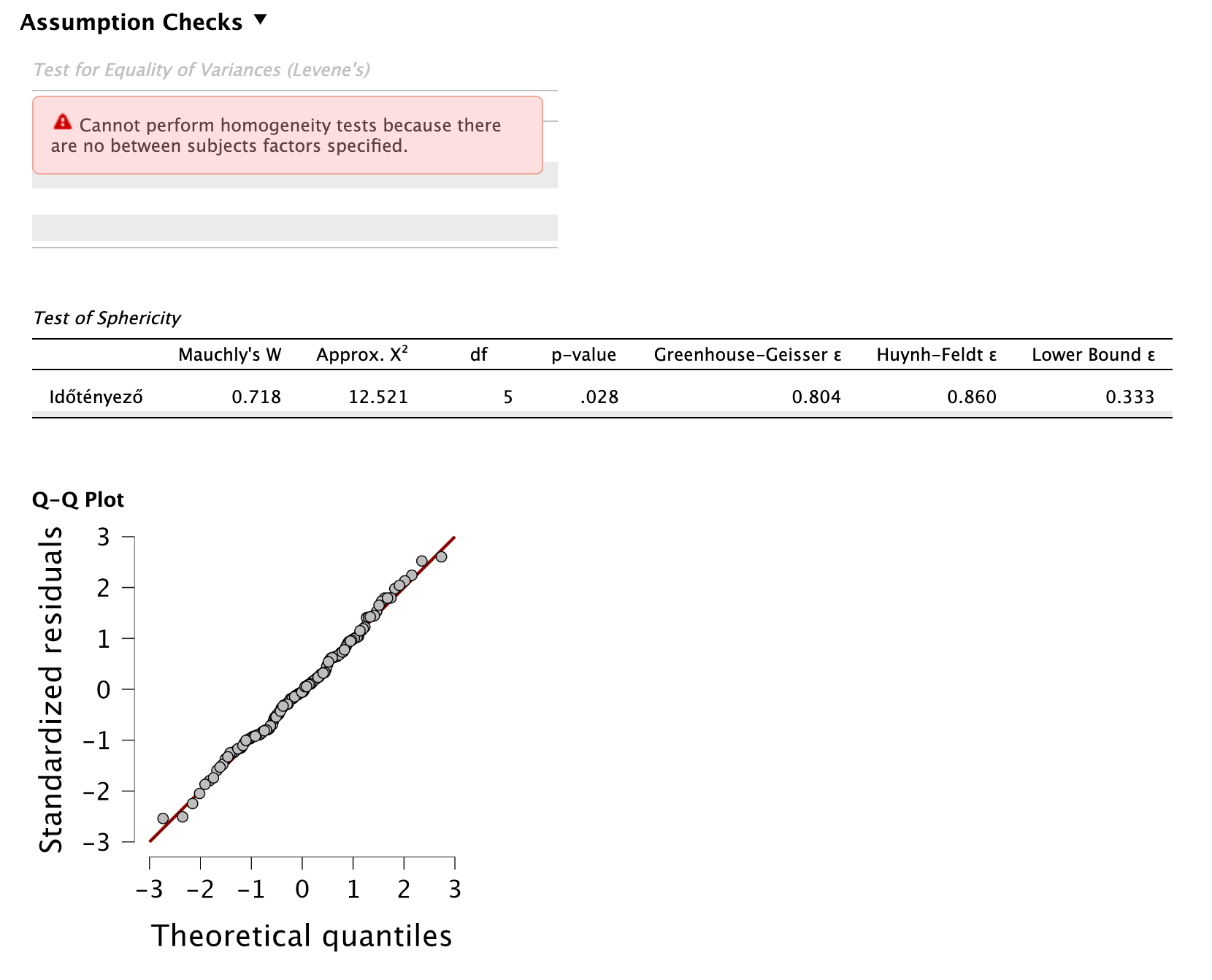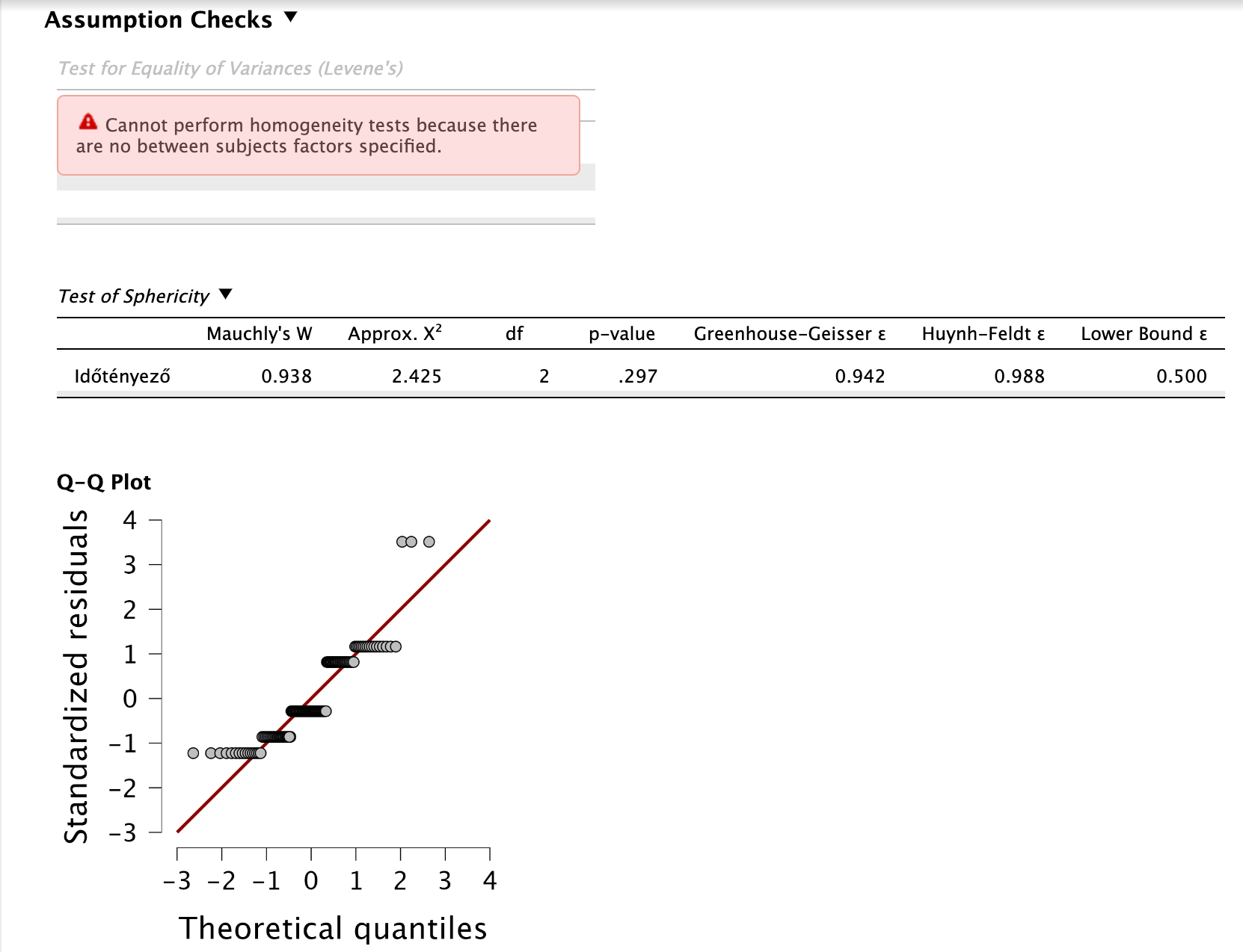 A függő változó mérésenként nem normál eloszlású. Ezt a leíró statisztikai modulban tudjuk vizsgálni Shapiro-Wilk próbákkal. Mindegyik esetben p < 0,05, tehát a normalitás feltétele sérül! A maradványértékek QQ plotja szintén specifikus mintázatot mutat, ami eltér az elvárt normál eloszlástól.