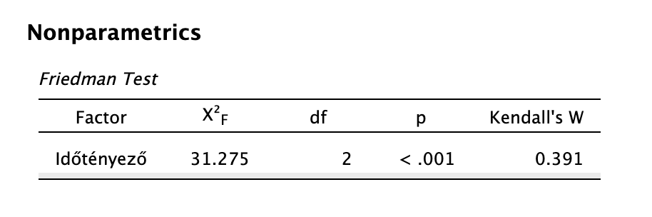 Szfericitás: A Mauchly-féle próba eredménye ugyan nem szignifikáns (p > 0,05), de ez nem is lényeges, mert ez nem feltétele a Friedman-próbának.