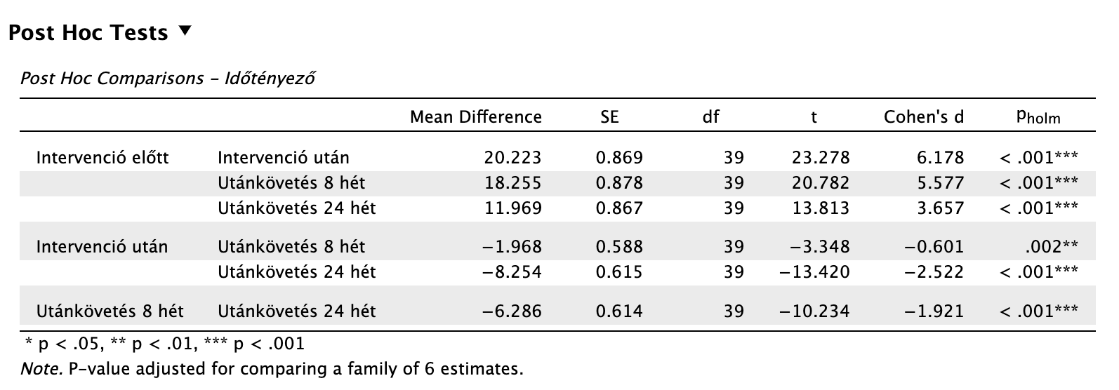 | Int. után | Utánk. 24 hét | -8,254 | t(39) = -13,420, pholm < 0,001, d = -2,522 |