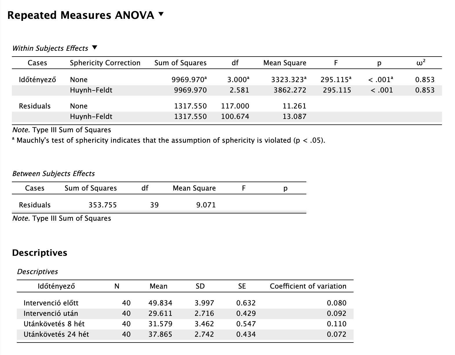 Ez esetben leolvassuk a Greenhouse-Geisser ε értékét. Ez Greenhouse-Geisser ε = 0,804 (> 0,75), ami azt jelenti, hogy Huynh-Feldt-korrekciót alkalmazunk.