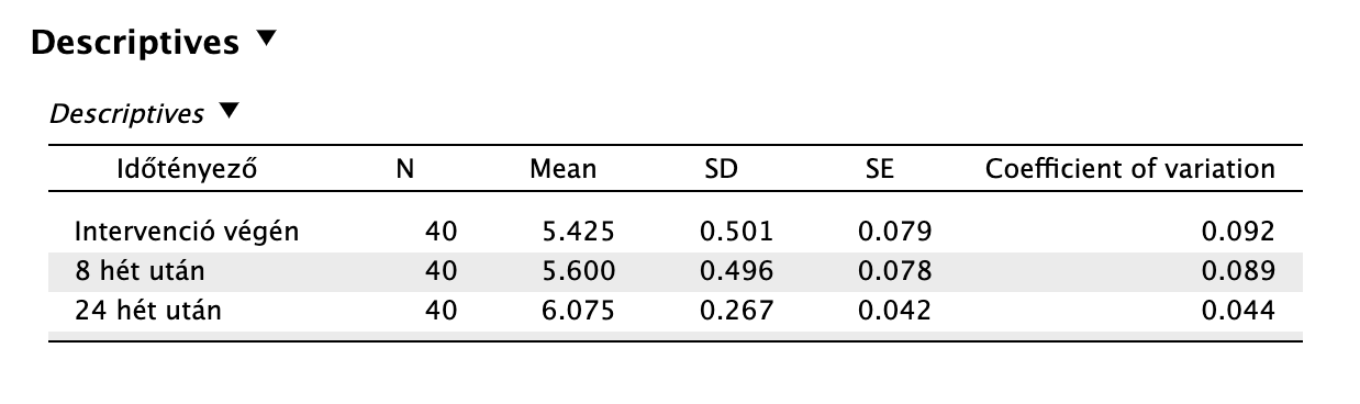 | Int. előtt | Utánk. 24 hét | 11,969 | t(39) = 13,813, pholm < 0,001, d = 3,657 |