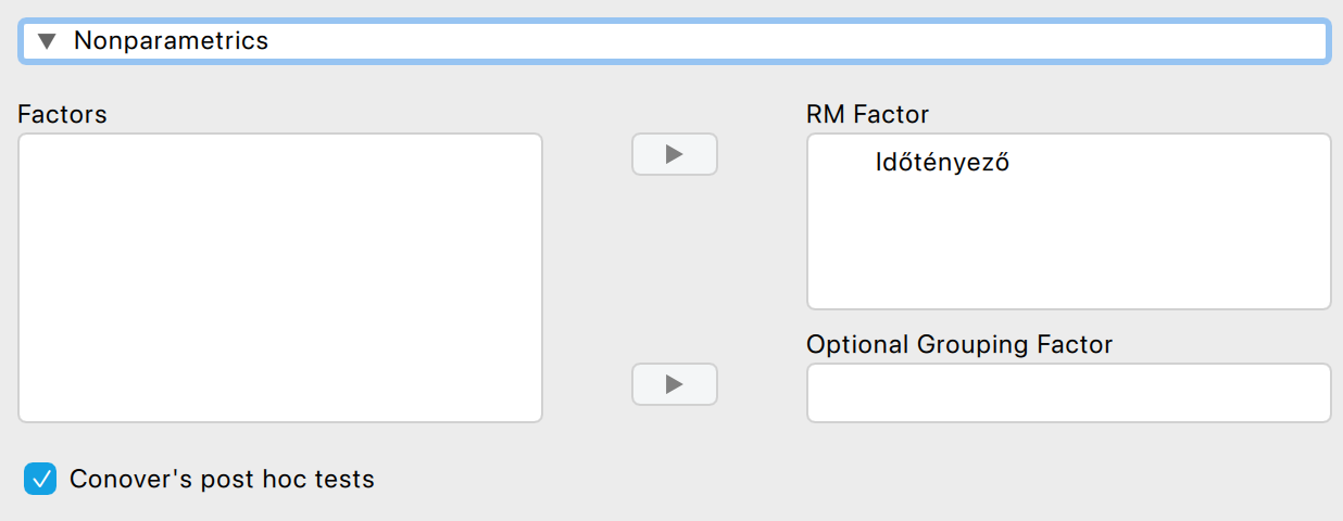 - Szignifikáns próba esetén bejelöljük a Conover-féle post-hoc tesztet.