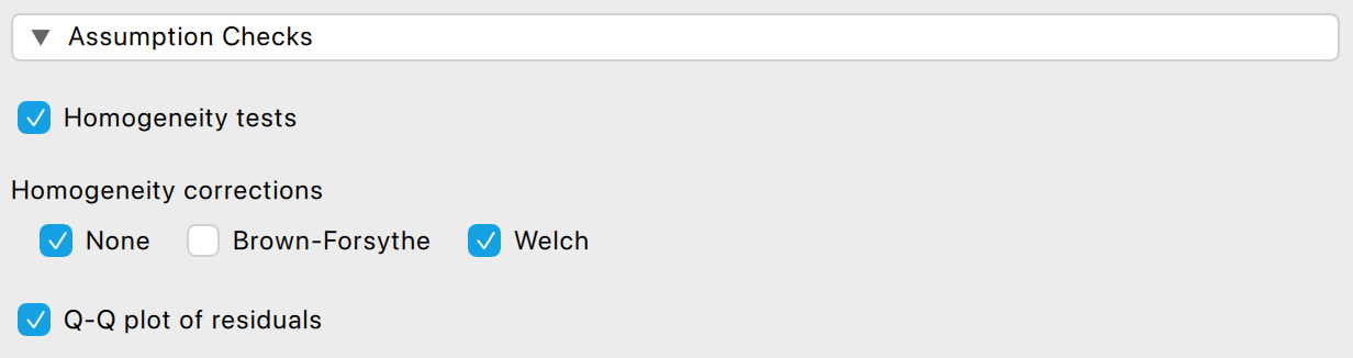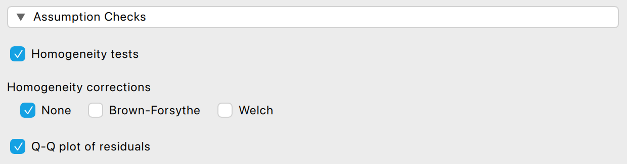 A JASP ANOVA moduljában található Assumption Checks szekcióban a Homogeneity tests funkció tartalmazza: a Levene-próba áll rendelkezésünkre. (Nem áll itt rendelkezésre Brown–Forsythe-próba.) Azt várjuk, hogy a Levene-próba eredménye ne legyen szignifikáns (vagyis p > 0,05 legyen), mert ez esetben feltételezhetjük, hogy fennáll a szóráshomogenitás az összehasonlítandó csoportok között.