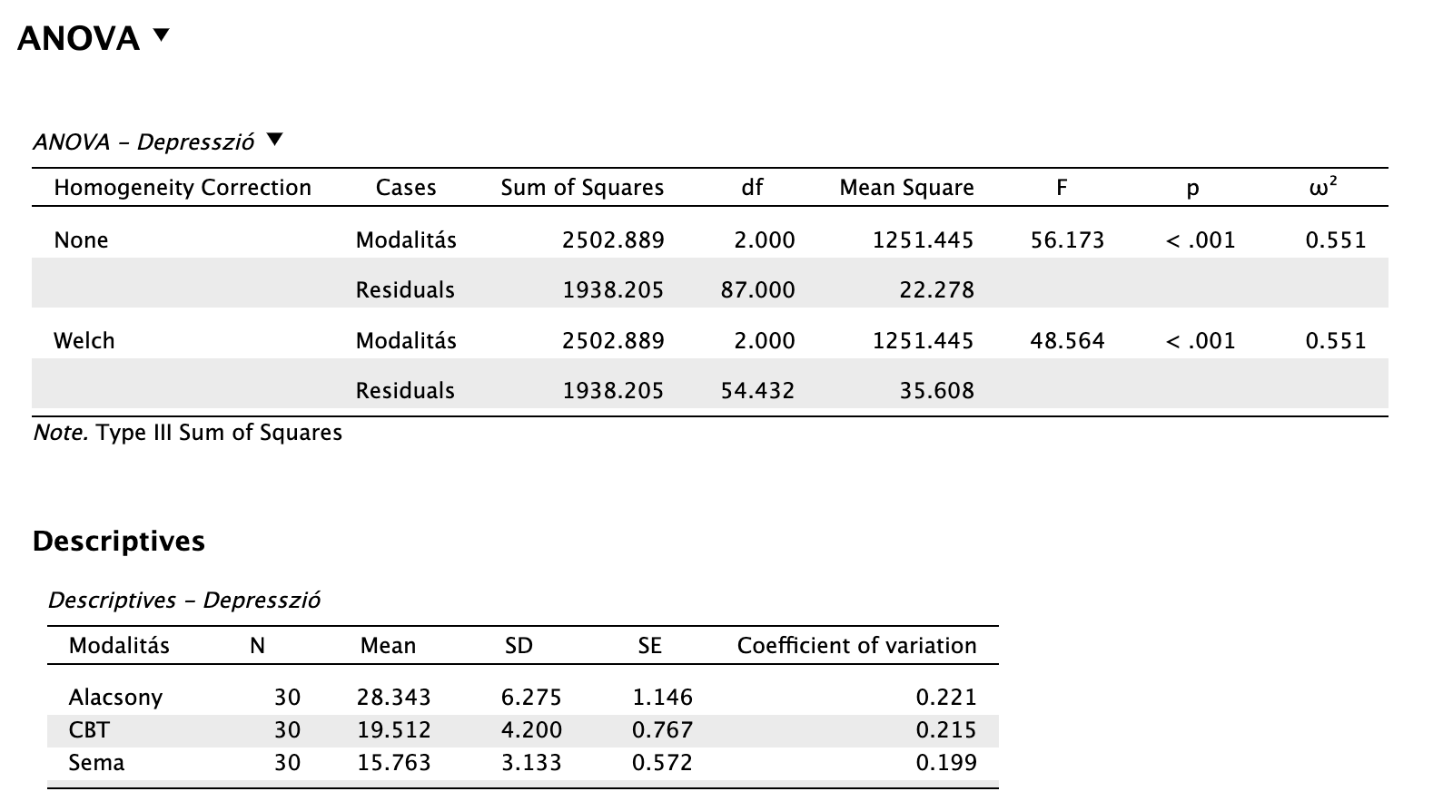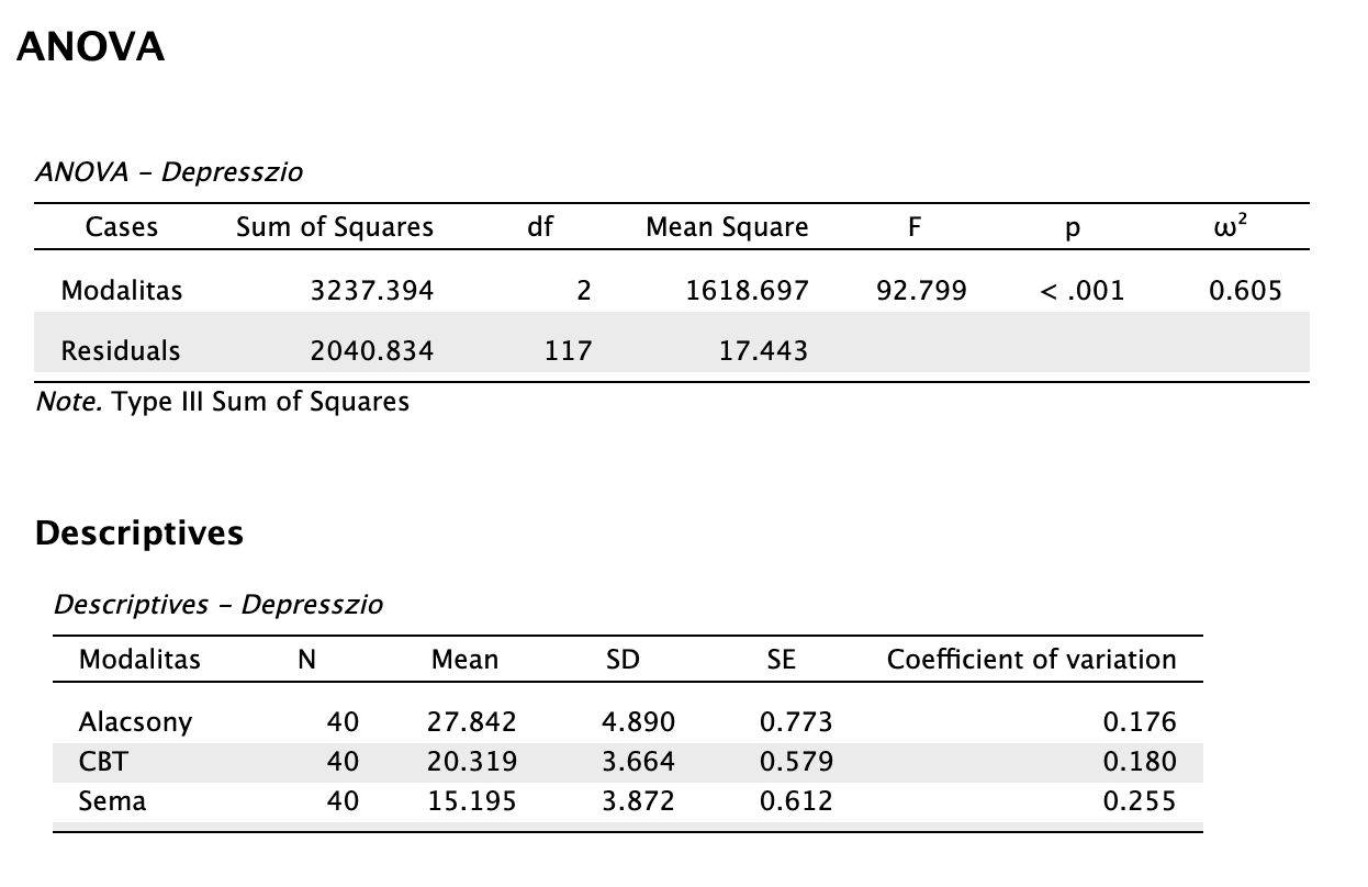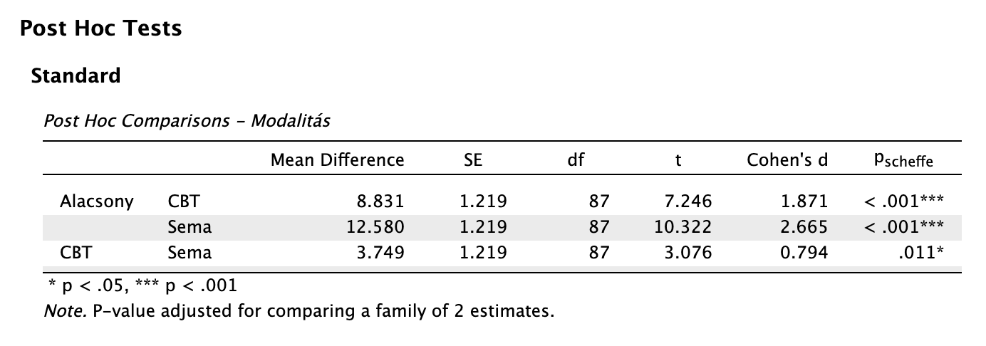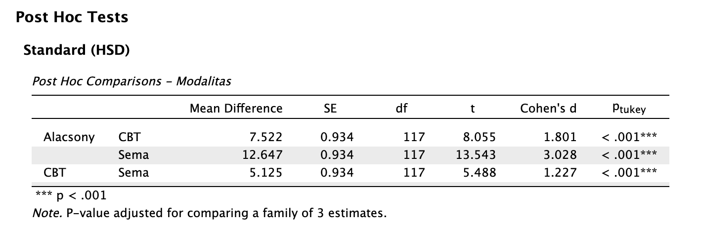 A modalitások közötti összkülönbség statisztikailag szignifikáns volt nagy hatásnagysággal: F(2, 117) = 92,799, p < 0,001, ω2 = 0,605. Az egyes csoportokra vonatkozó utóvizsgálatok eredménye szerint az alacsony intenzitású csoportnál mért átlagos depressziópontszám (M = 27,84, SD = 4,89) nagy hatásnagysággal statisztikailag szignifikánsan magasabb mind a CBT (M = 20,32, SD = 3,66; t(117) = 8,055, ptukey < 0,001, d = 1,801), mind a sématerápiás csoport átlagánál (M = 15,20, SD = 3,87; t(117) = 13,543, ptukey < 0,001, d = 3,028). Továbbá szintén nagy hatásnagyságú, statisztikailag szignifikáns különbséget találtunk a sématerápia és kognitív viselkedésterápia között is a sématerápia javára: t(117) = 5,488, ptukey < 0,001, d = 1,227.