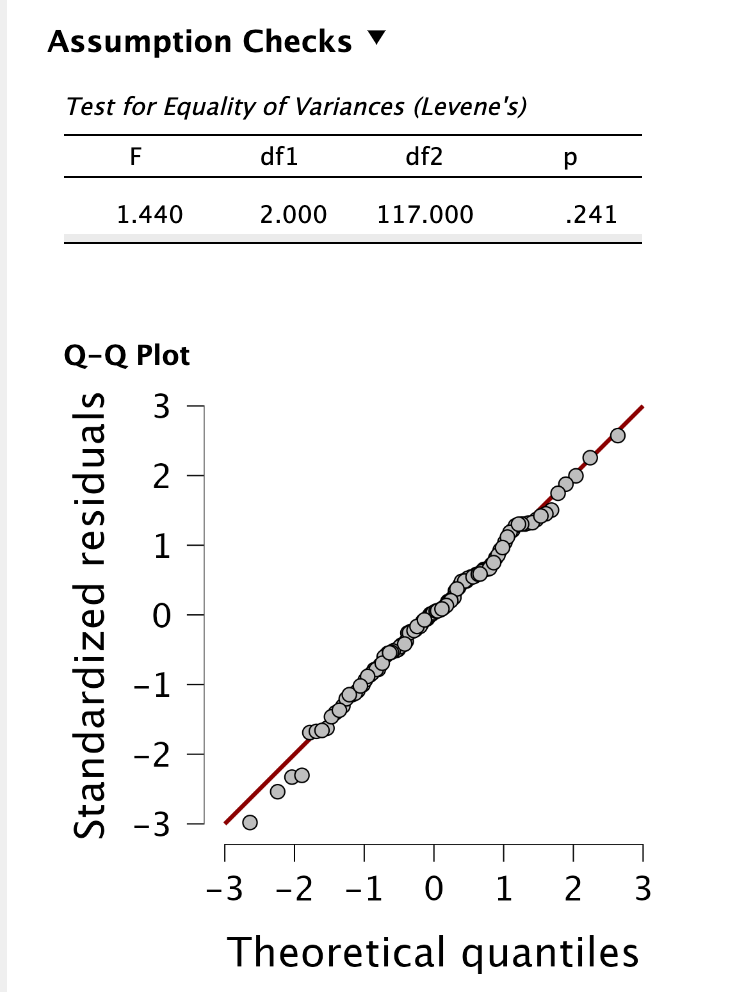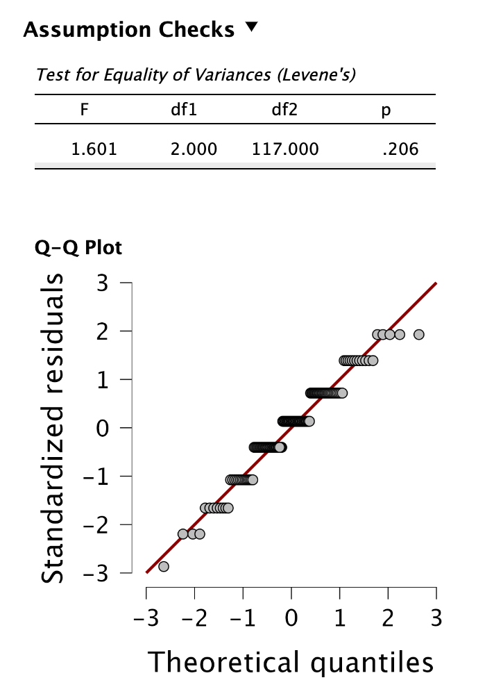 A terápiás modalitások összehasonlítására végzett egyszemponos VA feltételvizsgálatai alapján a maradványértékek normál eloszlást követtek a QQ plot szemrevételezése alapján, és fennállt a csoportok között a szóráshomogenitás a Levene-próba eredménye szerint: F(2, 117) = 1,440, p = 0,241.