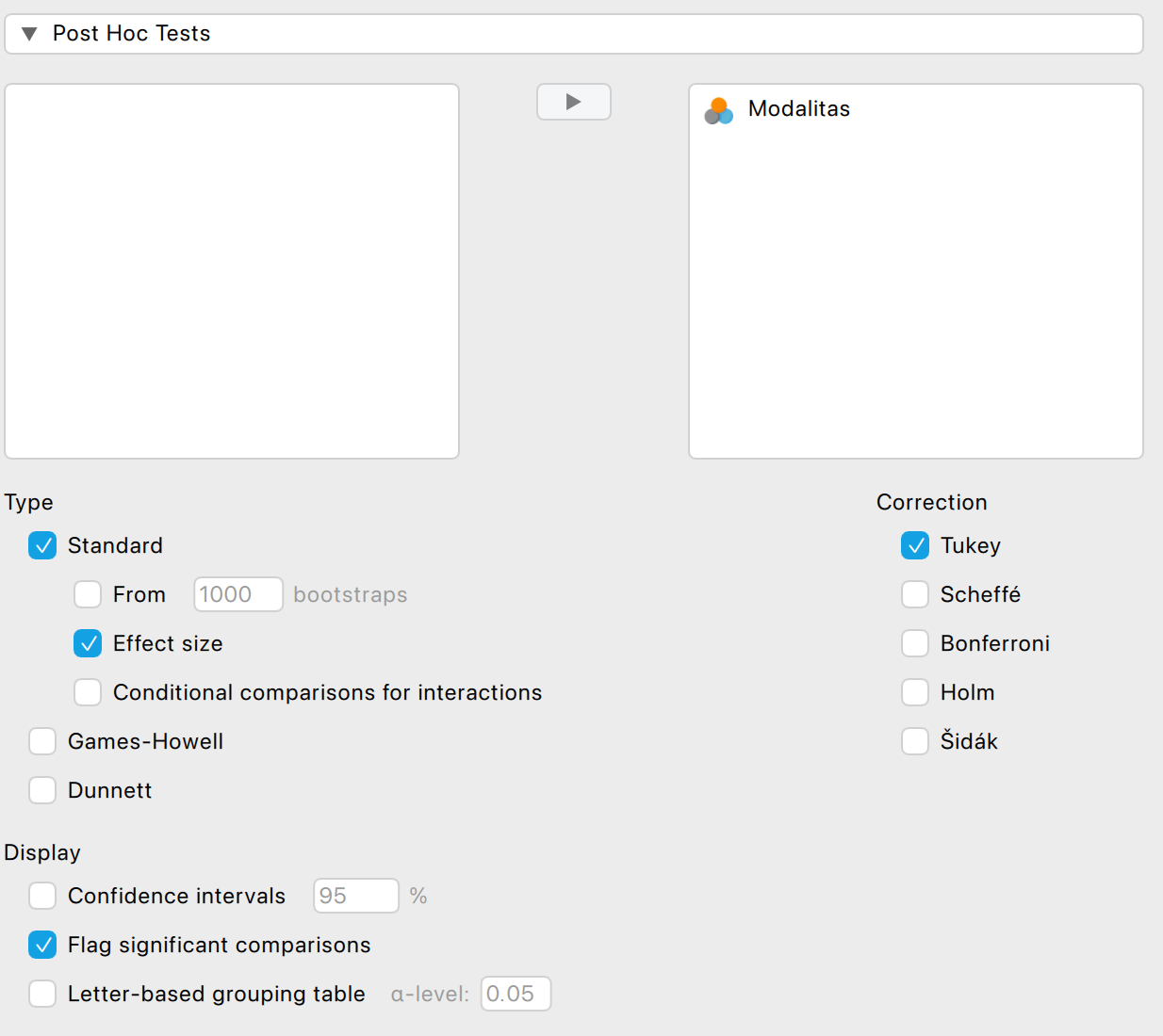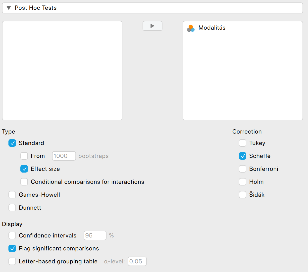 - a post-hoc teszt korrekciójára Games–Howell post-hoc korrekciót alkalmazunk JASP-ban. (A Dunnett próba itt nem a Dunnett T3-féle korrekciót jelöli.)