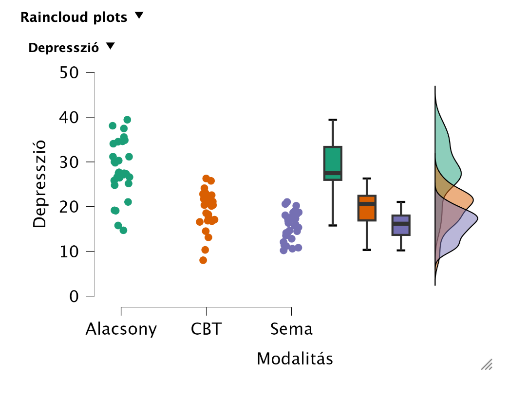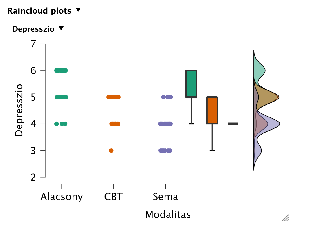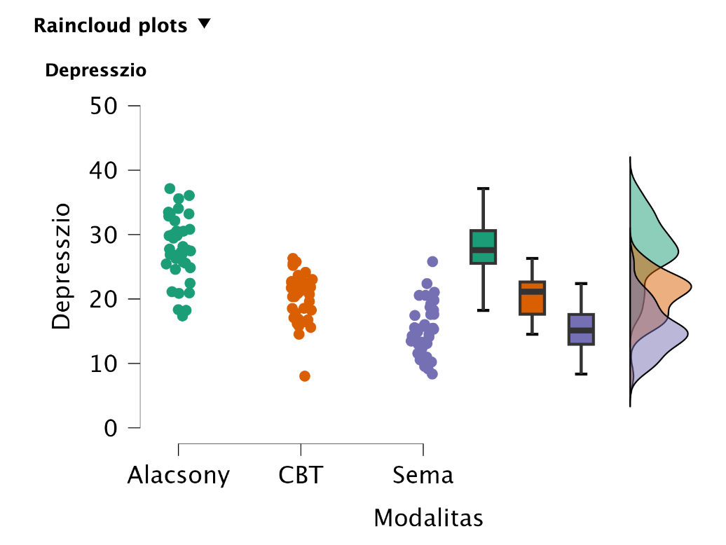 A leíró statisztikai mutatók között áz átlagok összehasonlításával „szemre” is láthatjuk, hogy viszonylag nagy különbségek vannak az átlagok között. Ezt ábrázolni is tudjuk többféle grafikonnal (Descriptives Plots, Bar Plots, Raincloud Plots). Ezek közül az eloszlásokat is a Raincloud Plots tartalmazza: