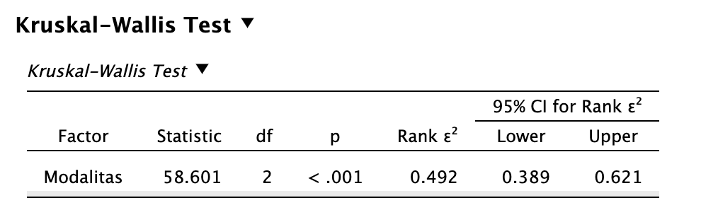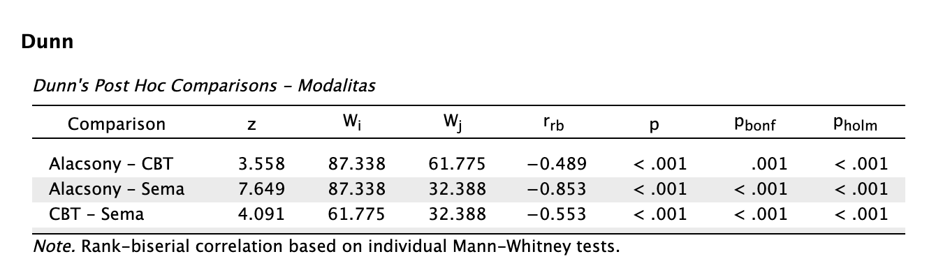 A post-hoc vizsgálatokra minden esetben a Dunn-féle post-hoc tesztet javasoljuk, ami a JASP-ban alapértelmezett (és íráskor egyetlen) módszer. Holm és Bonferroni-féle p-érték korrekciót is feltüntet majd az output. Javasoljuk a Holm-korrigált p-érték leolvasását. A hatásnagyságot az rrb rang-biszeriális korrelációs együttható biztosítja, aminek a nagyságát az r korrelációs együtthatóhoz hasonlóan értelmezzük (nem pedig a Cohen-d-hez hasonlóan).