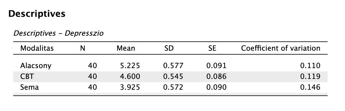 A csoportonkénti normál eloszlás a gyengébb feltétel, de elvégezhetjük a leíró statisztikai modulban. Láthatjuk, hogy a depresszió pontszám az alacsony intervenció és sématerápia csoportokban normál eloszlást követ, de a CBT csoportban nem. A csoportok elemszáma viszont tökéletesen megegyezik és kellő nagyságú.