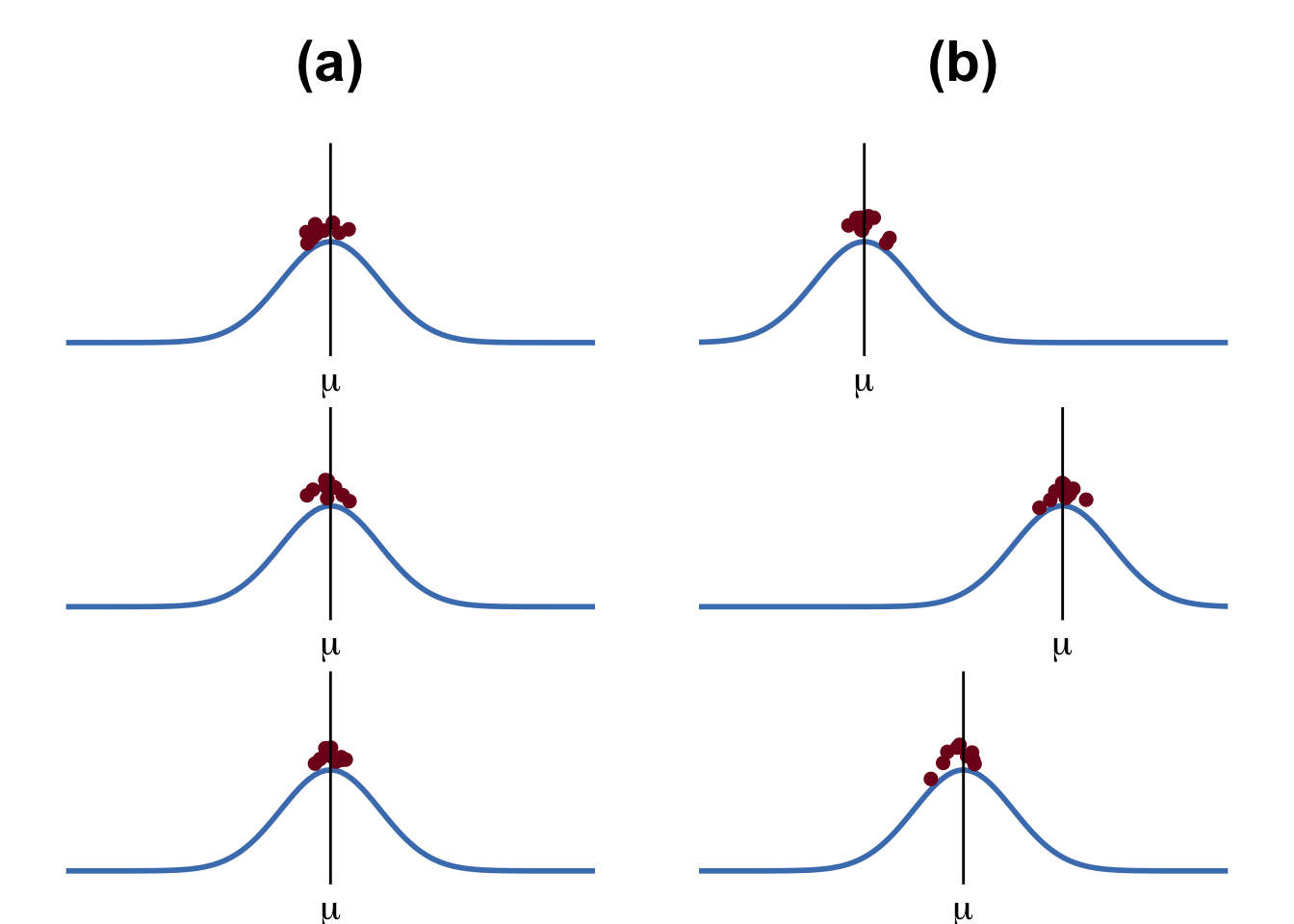 A varianciaanalízis során a t-próbákhoz hasonlóan szintén mintaátlagokat hasonlítunk össze, de ezúttal kettőnél több mintát. Az alábbi ábrán látható, hogy az (a) oszlopban lévő minták átlagai között nincs különbség, míg a (b) oszlopban lévők között van. Ezeknek a különbségeknek a meglétét és szignfikanciáját vizsgáljuk.