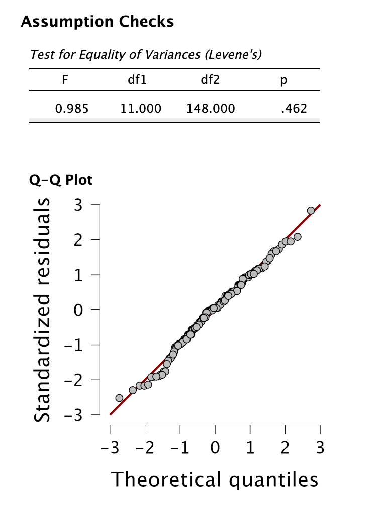 Ez egy túlságosan érzékeny vizsgálat, az egyszerű többszempontos ANOVA esetén nem fontos feltétel. A MANOVA (többváltozós varianciaanalízis) esetén lesz kiemelten fontos feltétel, a JASP MANOVA modulja tartalmazza csak ennek megfelelően.