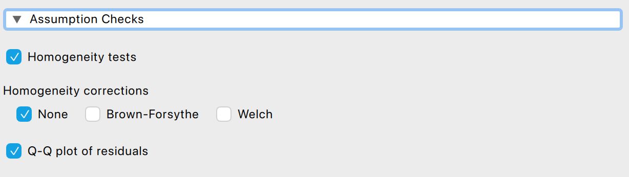 A JASP ANOVA moduljában található Assumption Checks szekcióban a Homogeneity tests funkció tartalmazza: a Levene-próba áll rendelkezésünkre. (Nem áll itt rendelkezésre Brown–Forsythe-próba.) Azt várjuk, hogy a Levene-próba eredménye ne legyen szignifikáns (vagyis p > 0,05 legyen), mert ez esetben feltételezhetjük, hogy fennáll a szóráshomogenitás az összehasonlítandó csoportok között.
