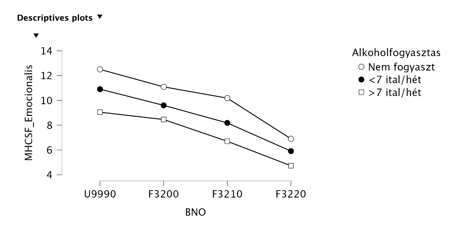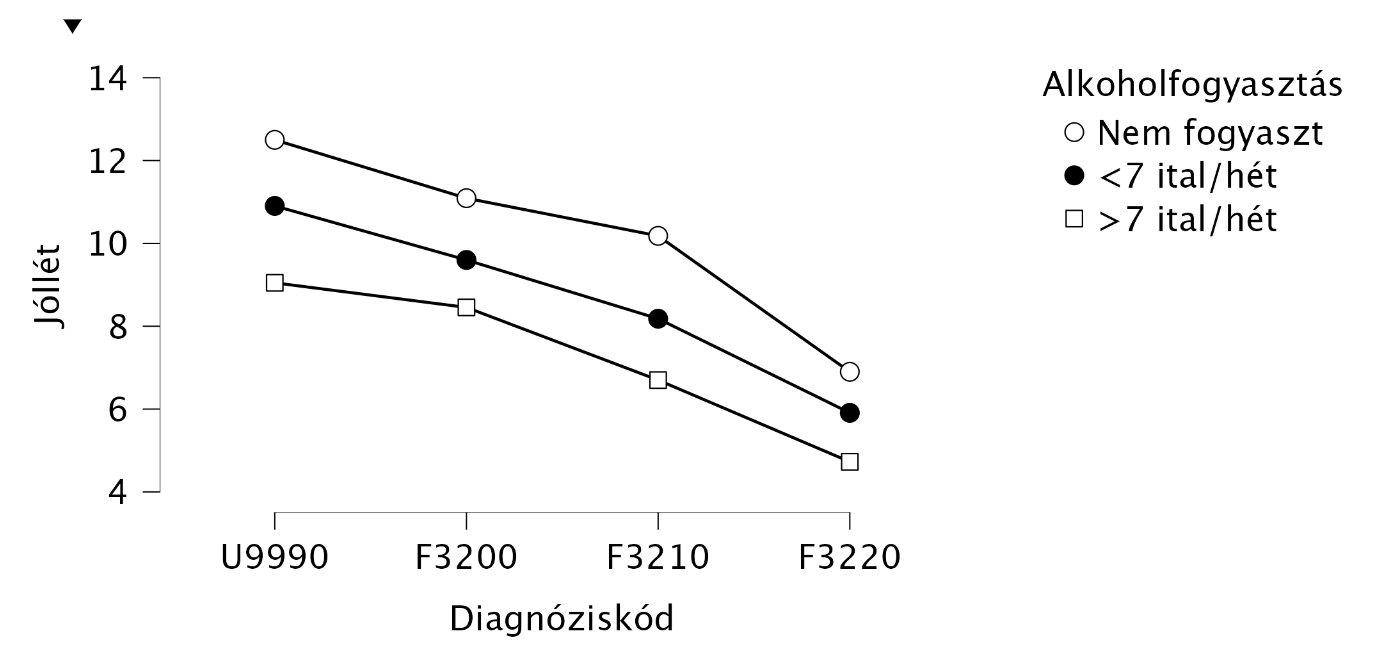 Leolvashatjuk, hogy minél súlyosabb depresszióval diagnosztizáltak valakit, annál alacsonyabb az érzelmi jólléte (diagnózis főhatás). Azt is látjuk, hogy következetesen magasabb jóllét pontszáma van annak, aki minél kevesebb alkoholt fogyaszt (alkoholfogyasztás főhatás). Az ábrán nagyjából azonos ütemű csökkenések és távolságok láthatók, nincs ollószerű „szétnyílás” (ordinális hatás), se sorrendváltás (diszordinális hatás): ez egybecseng a nem szignifikáns interakcióval.