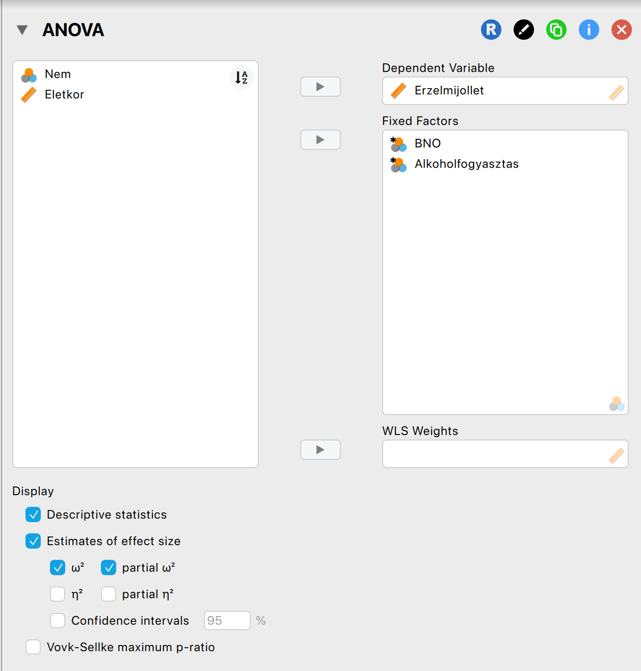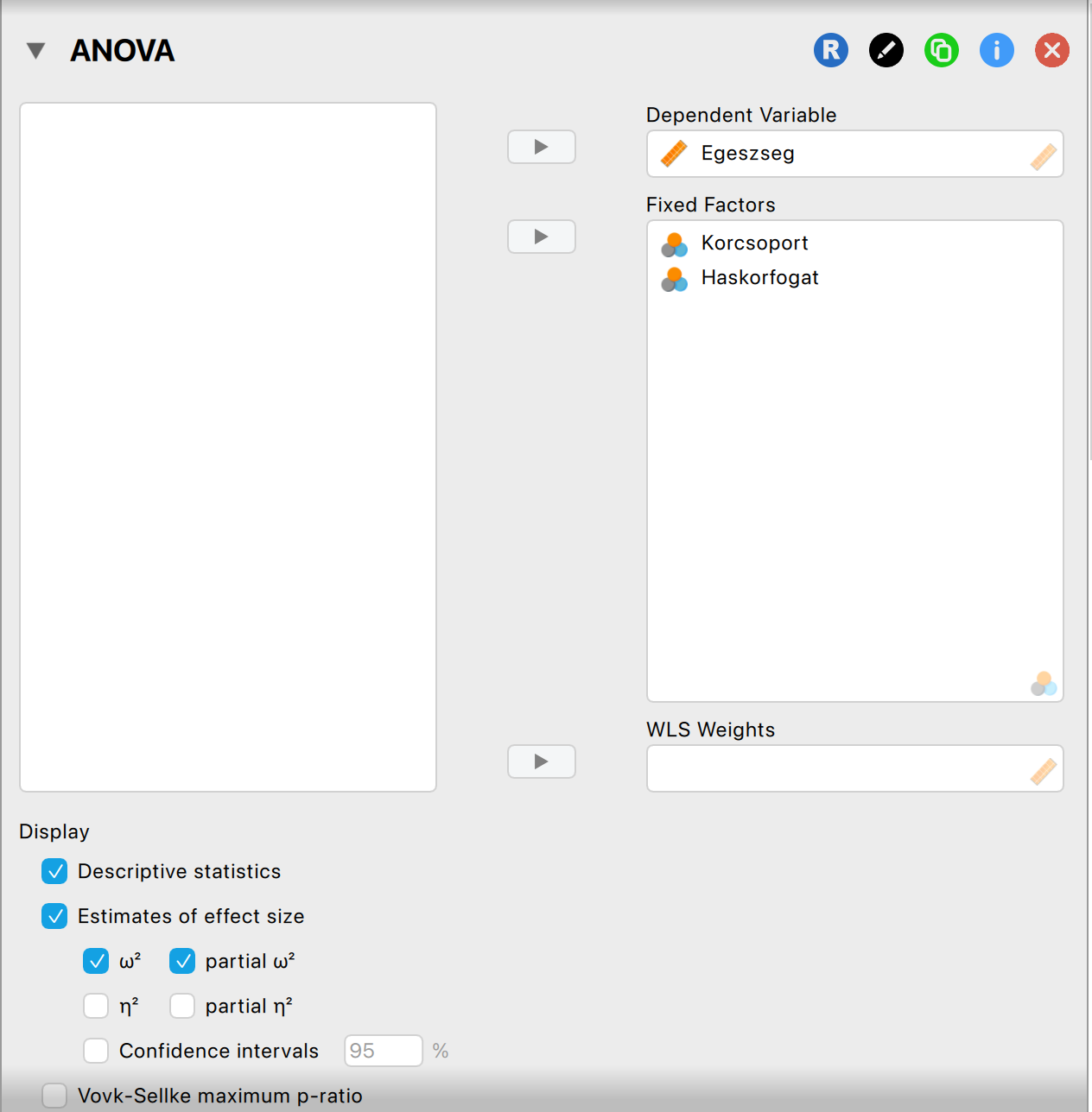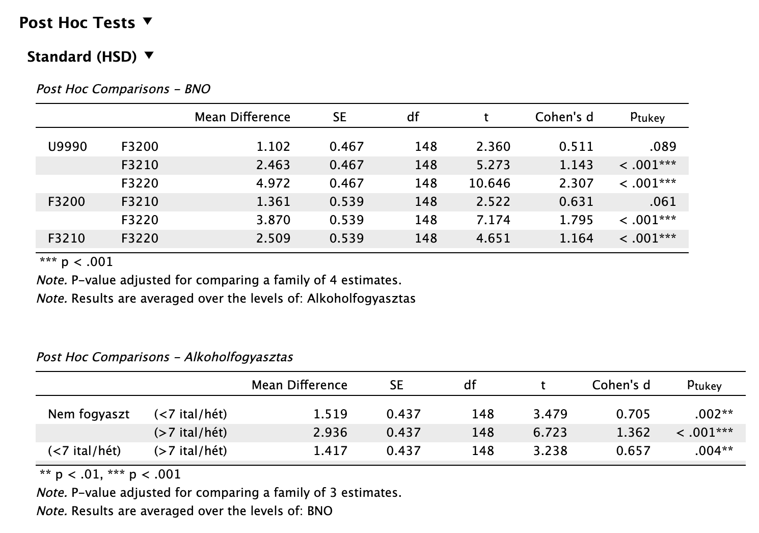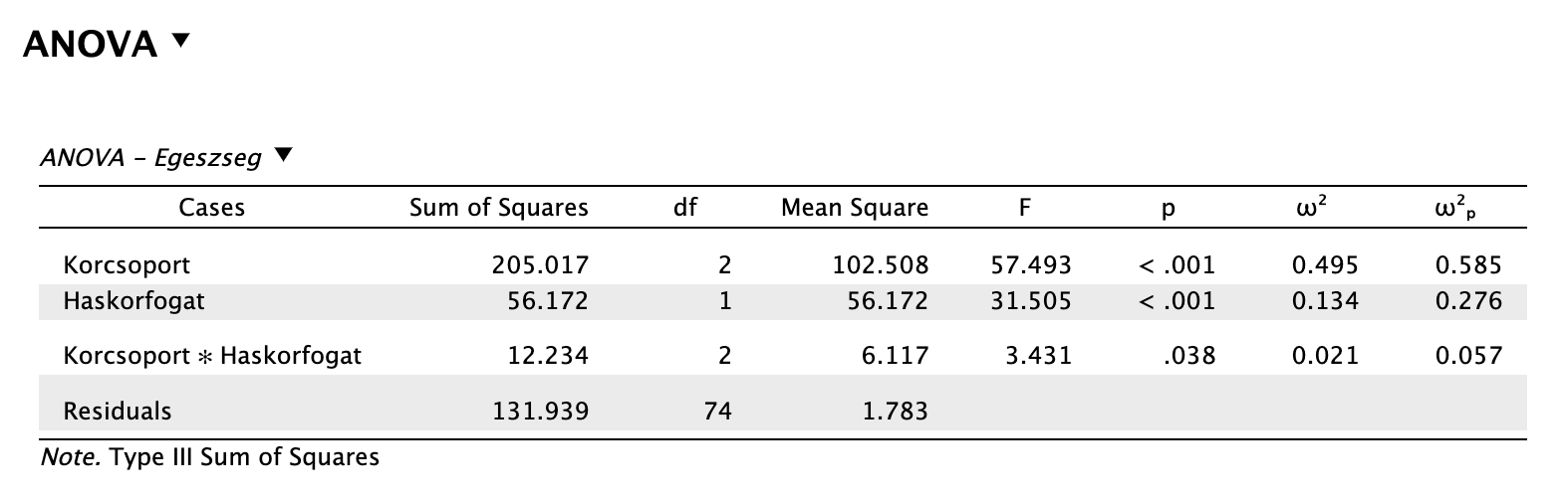 Az ANOVA táblában láthatjuk a parciális ómega-négyzet ω2p mutató alapján, hogy a diagnózis szempontunk a modell varianciájának 42,2%-át magyarázza (ω2p = 0,422), míg az alkoholfogyasztási szokások a variancia 21,3%-át magyarázzák.