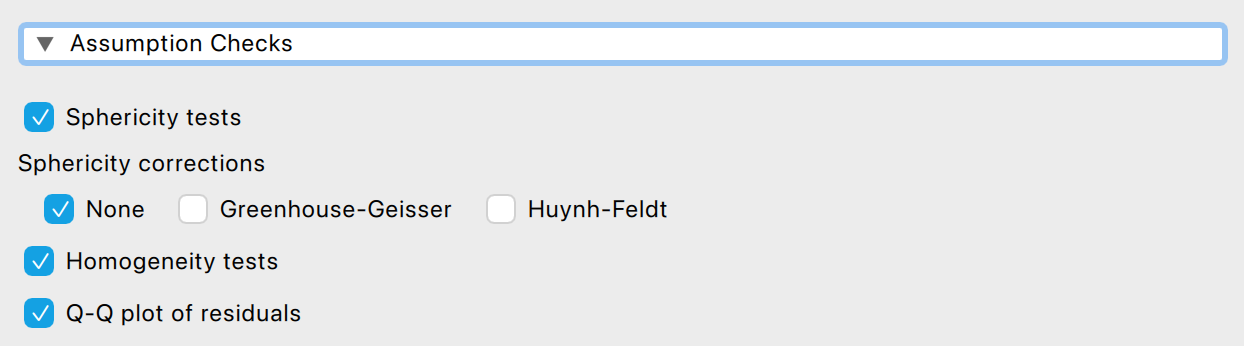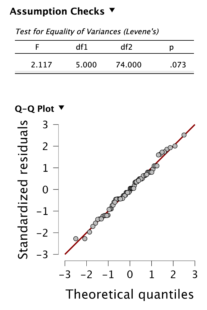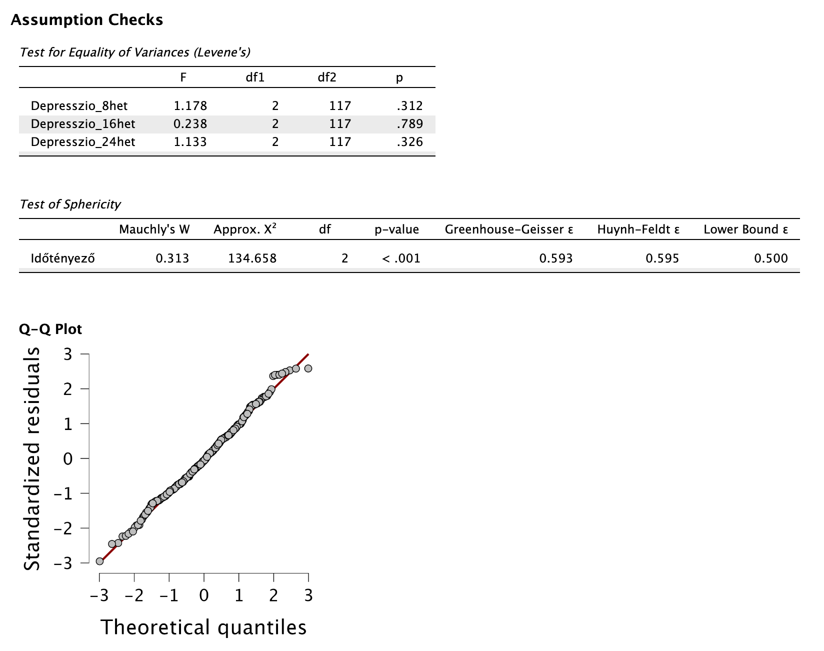 A maradványértékek normalitása QQ plot szemrevételezése alapján teljesül. (A standardizált maradványértékeket új változóként hozzáadva Shapiro-Wilk próbával is tudnánk ellenőrizni a feltétel teljesülését normál ANOVA esetén, de jelenleg a JASP-ban ismételt mérés esetén nem elérhető a funkció.)