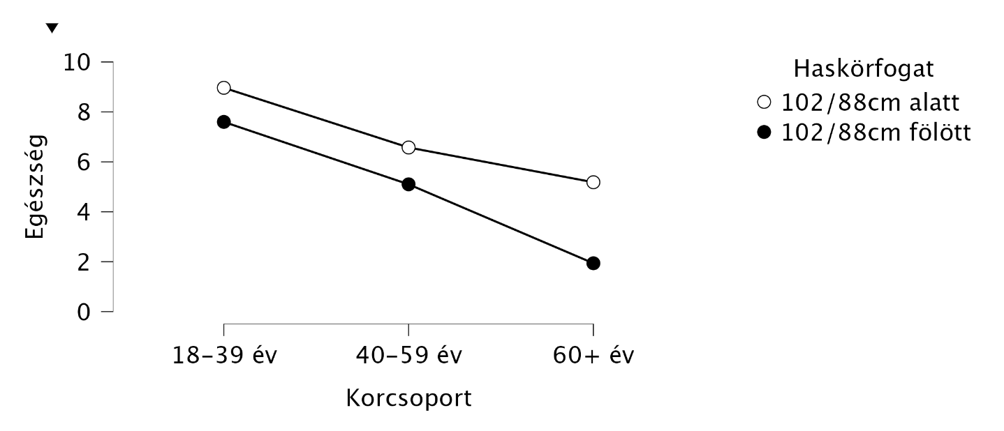 Láthatjuk, hogy ordinális interakcióról van szó, mert „nyíló olló” alakot láthatunk és nincs kereszteződés. Leolvashatjuk az ábráról, hogy a 102/88 cm haskörfogat feletti személyek rosszabb egészségi állapottal rendelkeznek, mint a kritikus szint alattiak, de minél idősebb személyről van szó, a „beesés” annál látványosabb magasabb haskörfogat esetén. Illetve az alacsonyabb haskörfogatnál „lassul” a csökkenés.