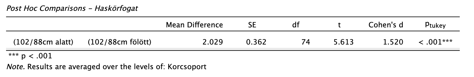 Mindenesetre az eredményeket leolvasva láthatjuk, hogy átlagos korcsoport mellett a haskörfogatok szerint különbség van az egészségpontszámokban, nagy hatásnagysággal.
