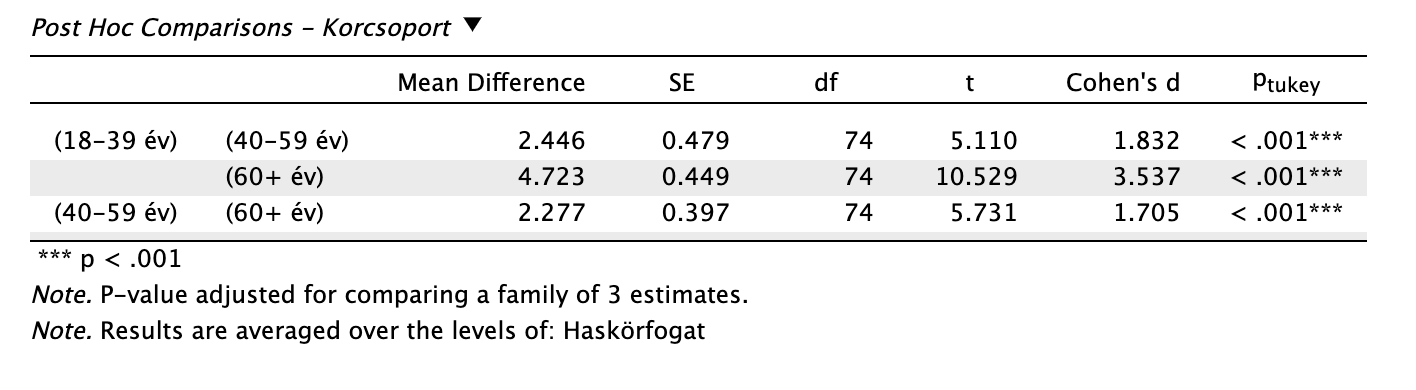 Tukey-korrigált post-hoc teszt Az eredményeket leolvasva láthatjuk, hogy átlagos haskörfogat mellett az életkori csoportok szerint különbség van az egészségpontszámokban, ismét nagy hatásnagysággal (d).